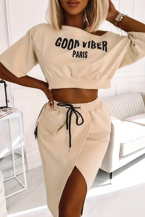 - Topul are un imprimeu și o lungime crop, iar fusta are o talie înaltă, elastică, cu legături și o fante sexy.