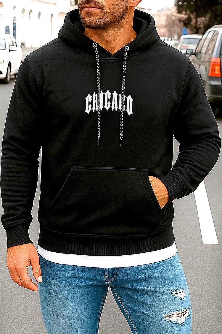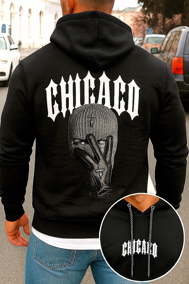 - Modelul de culoarea neagră are un imprimeu pe spate cuo față mascată cu inscripție CHICAGO.