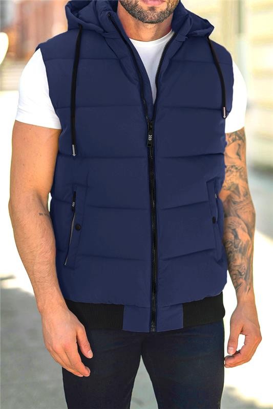 - Vesta are buzunare cu fermoar și o glugă detașabilă cu șnururi reglabile.