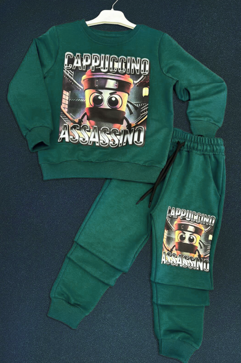 - Set pentru copii format din două piese, bluză și pantaloni cu un model de culoare uni și imprimeu la modă.