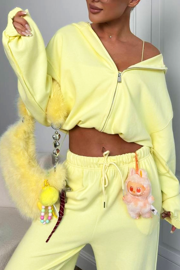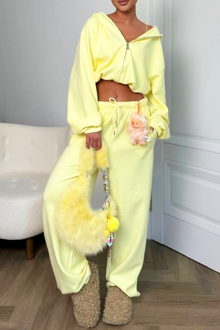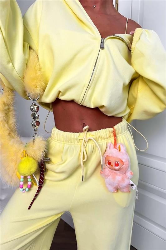 - Hanoracul este scurt, cu glugă, combinat cu pantaloni cu talie elastică înaltă cu linie evazată pentru un look modern.