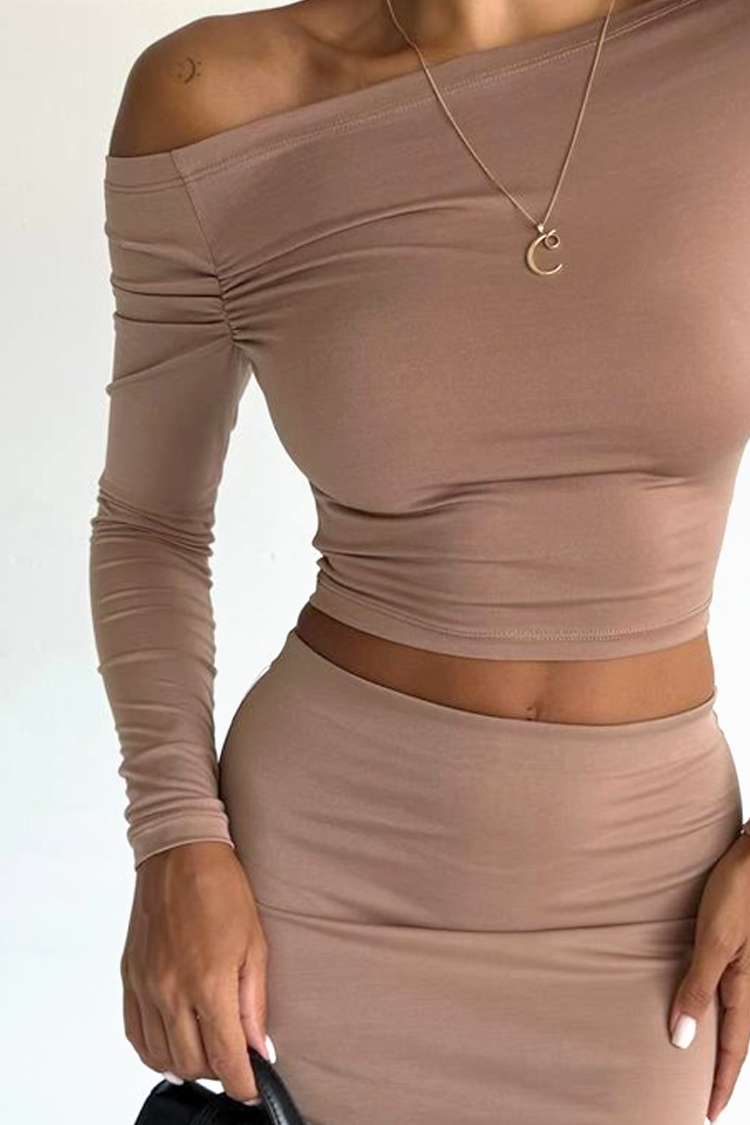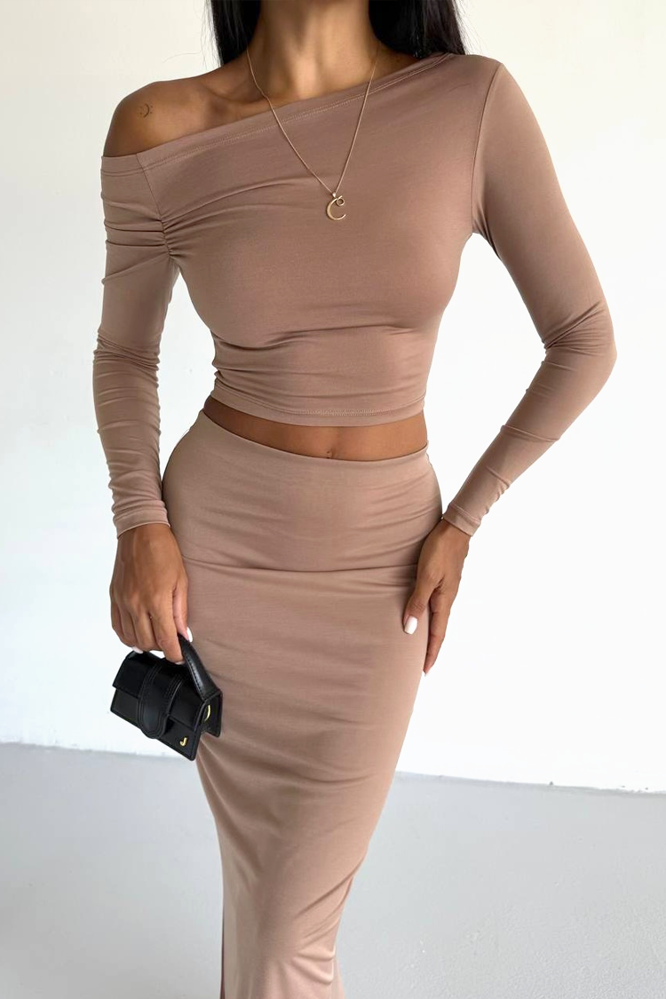 - Set elegant din două piese - bluză și fustă lungă, de culoare bej.