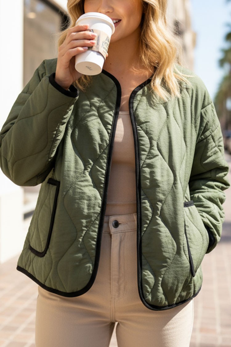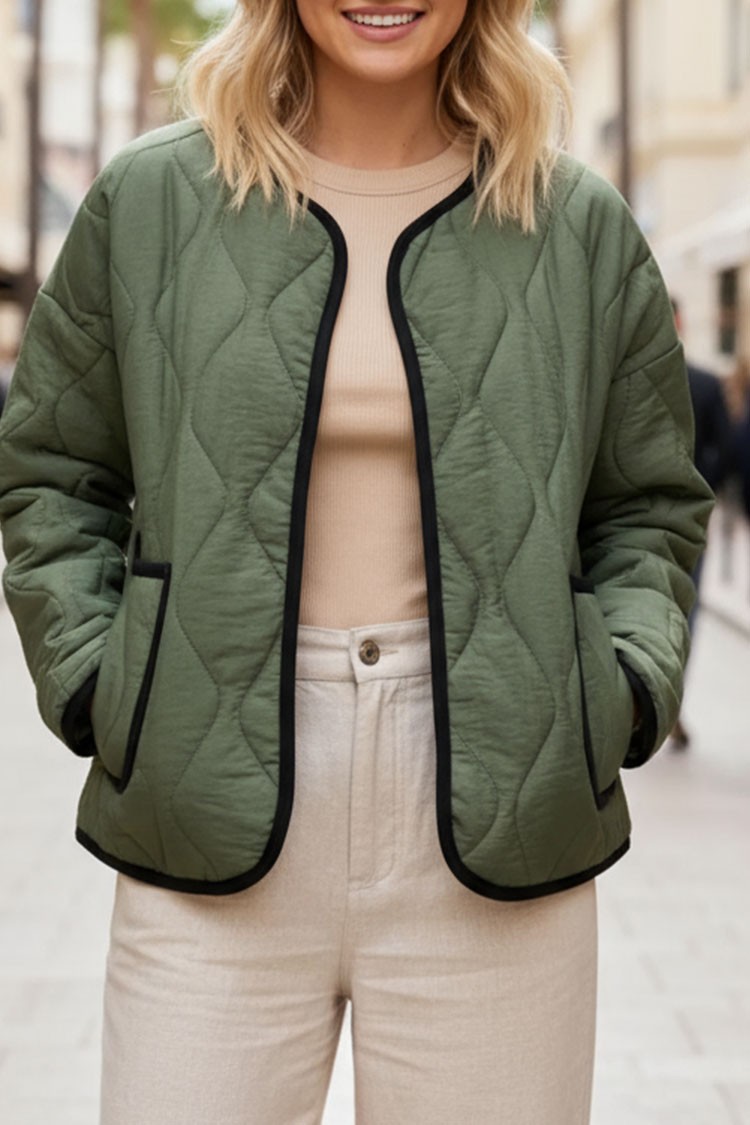 - Modelul are o croială confortabilă, buzunare laterale practice și un design matlasat de culoare verde.