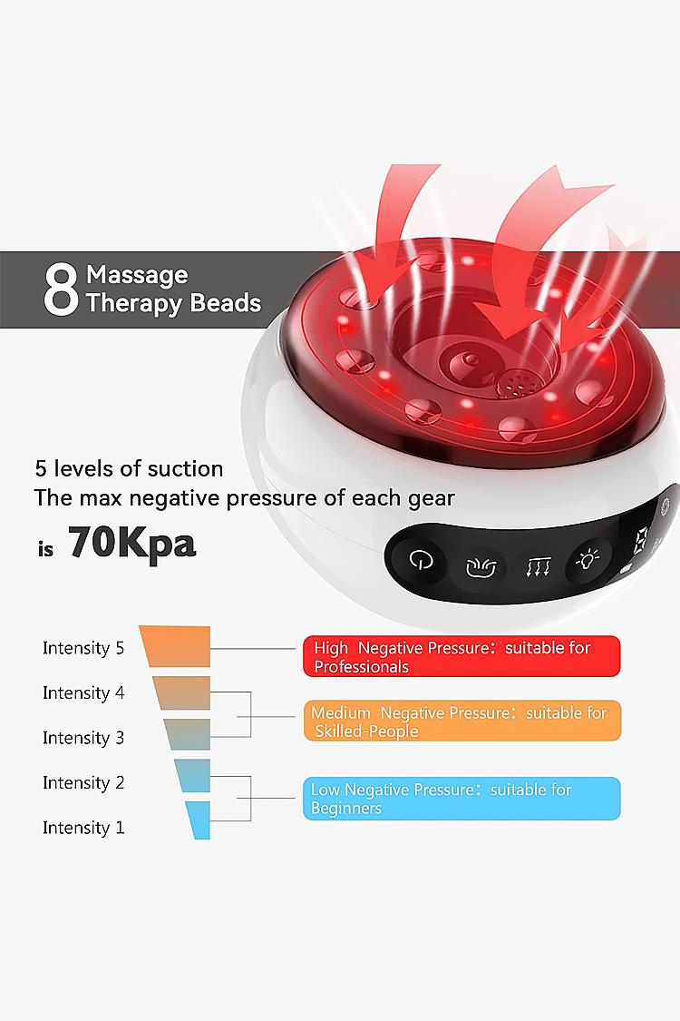 - Setări personalizate – Oferă 5 niveluri de aspirație cu vid și 3 moduri de temperatură (38 °C, 41 °C, 44 °C), cu pietre magnetice încorporate pentru a stimula fluxul de energie.