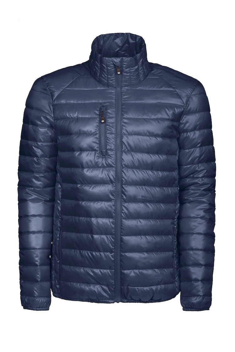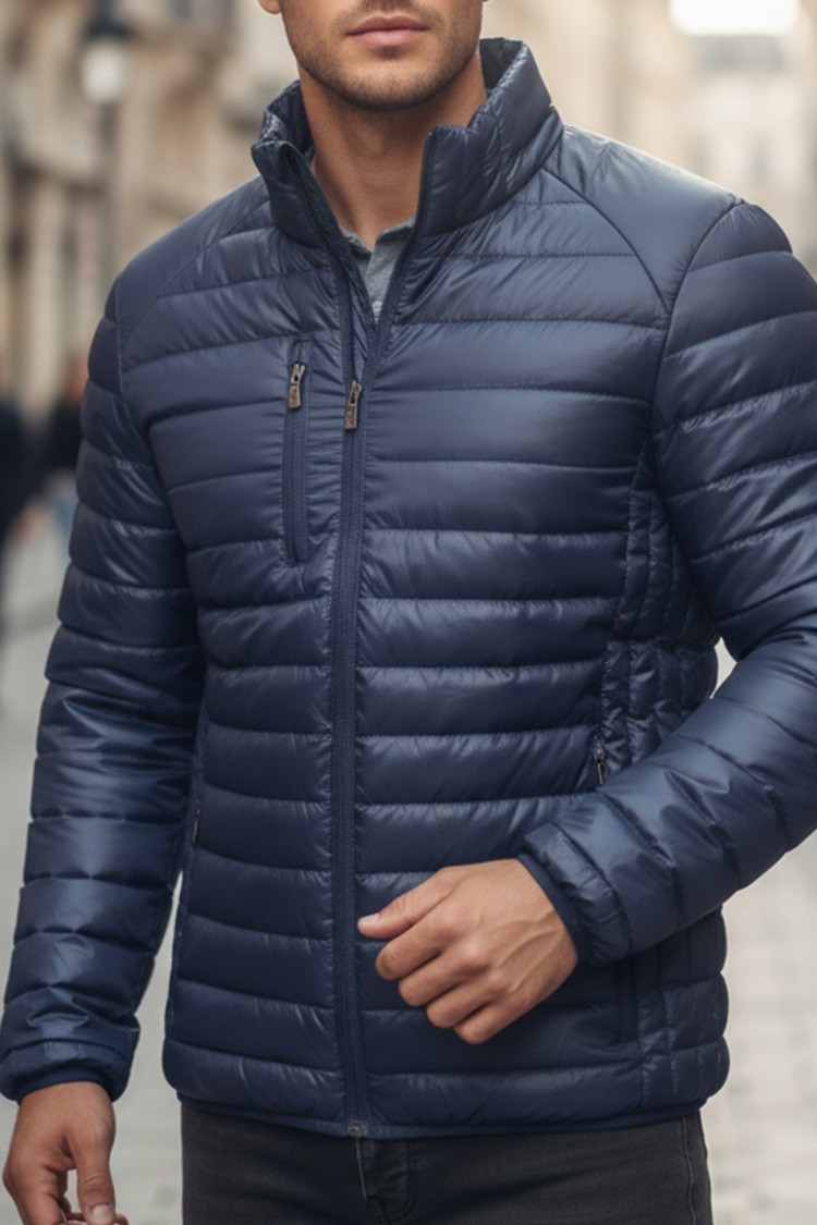 - Geacă pentru bărbăti confortabilă, de culoare albastru închis, cu închidere centrală cu fermoar și buzunare.