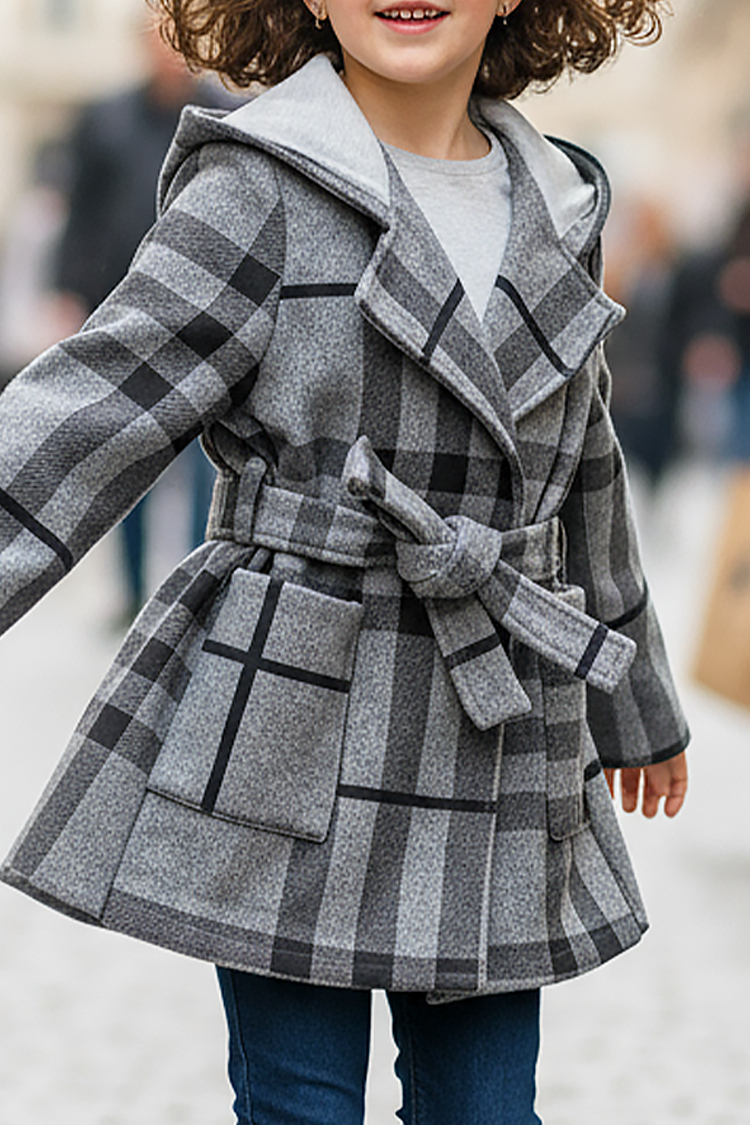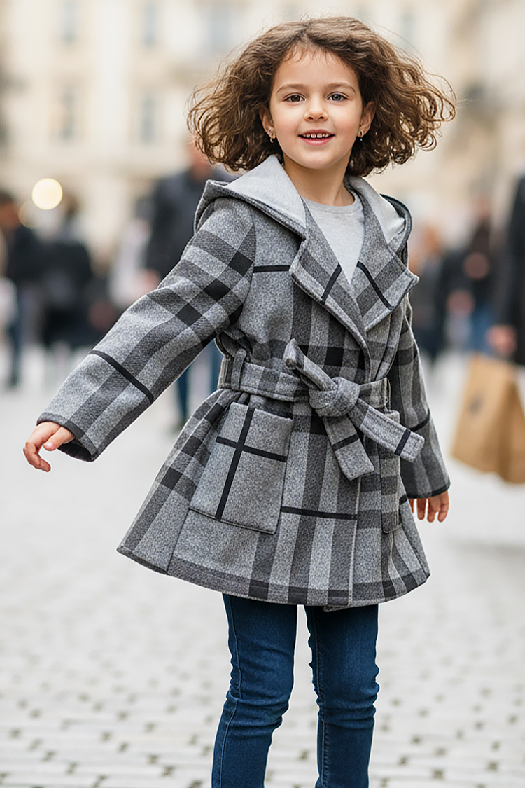 - Palton modern pentru copii, de culoare gri, potrivit pentru ținute de zi cu zi și la modă.