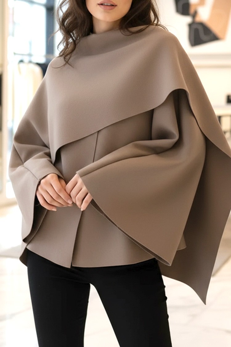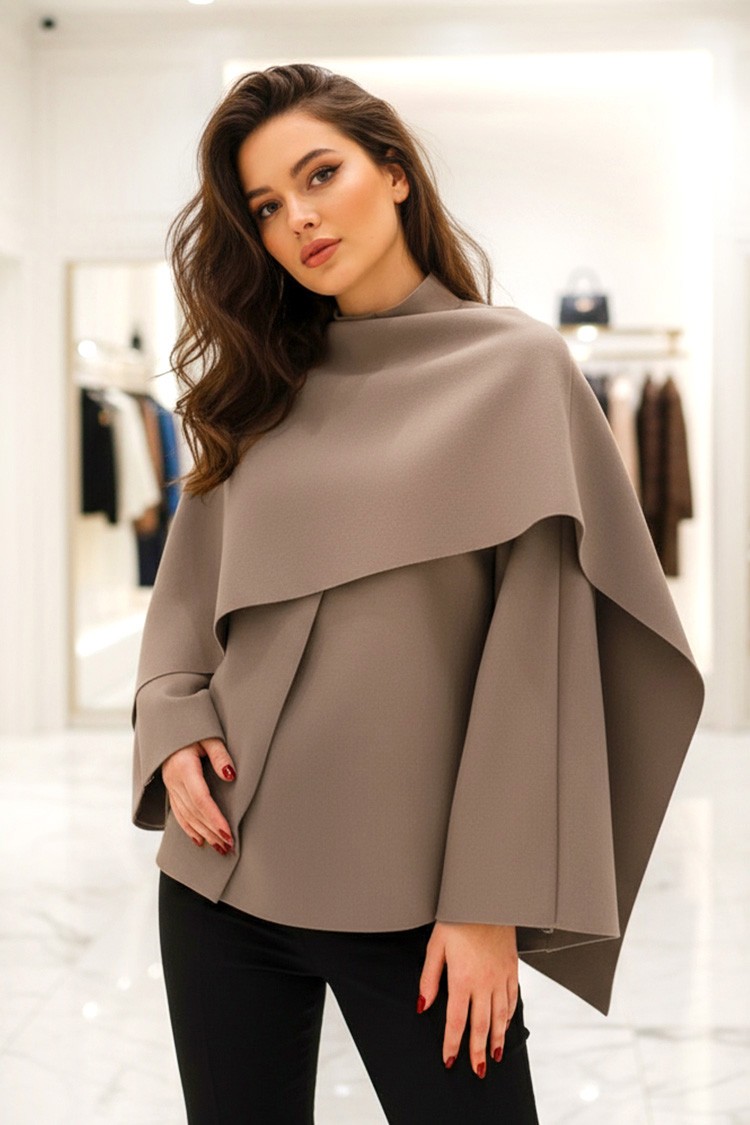- Modelul are o croială asimetrică, mâneci largi și spectaculoase și o culoare mocha.