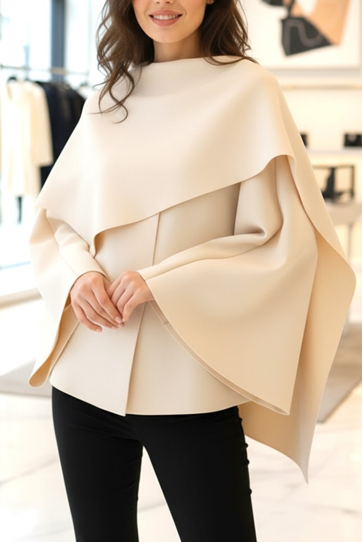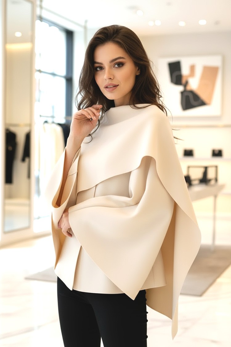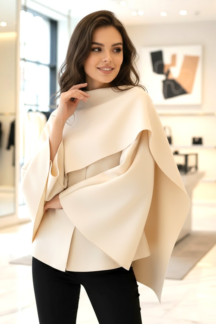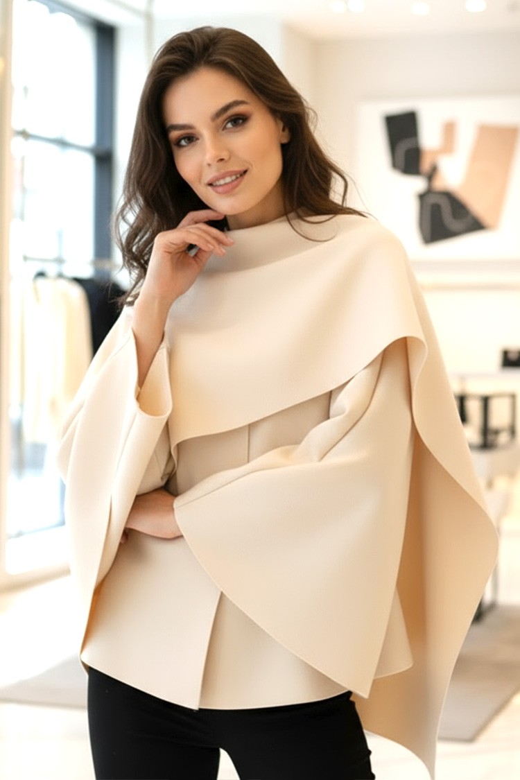 - Modelul are o croială asimetrică, mâneci largi și spectaculoase și o culoare ecru.
