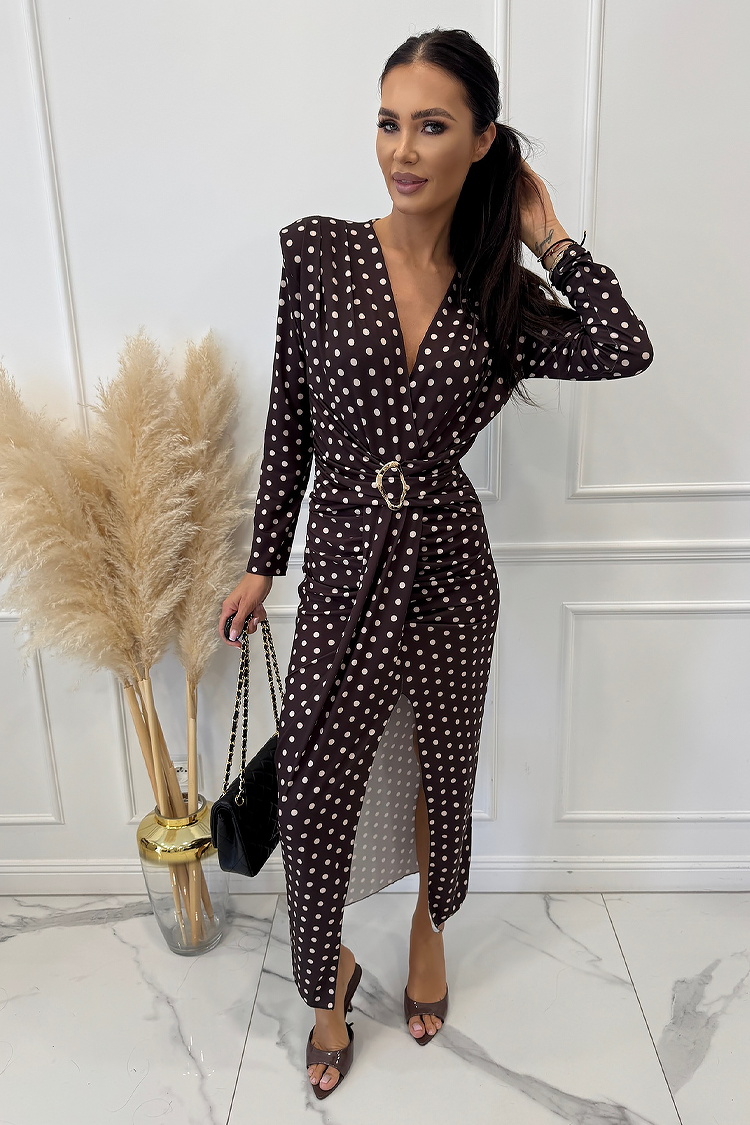 - Rochia are mâneci lungi, o croială mulată și un decolteu V, precum și o curea spectaculoasă cu accent metalic.