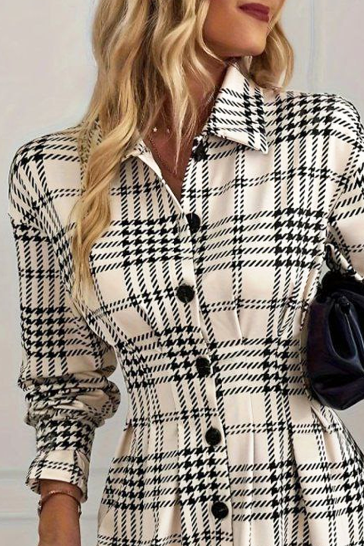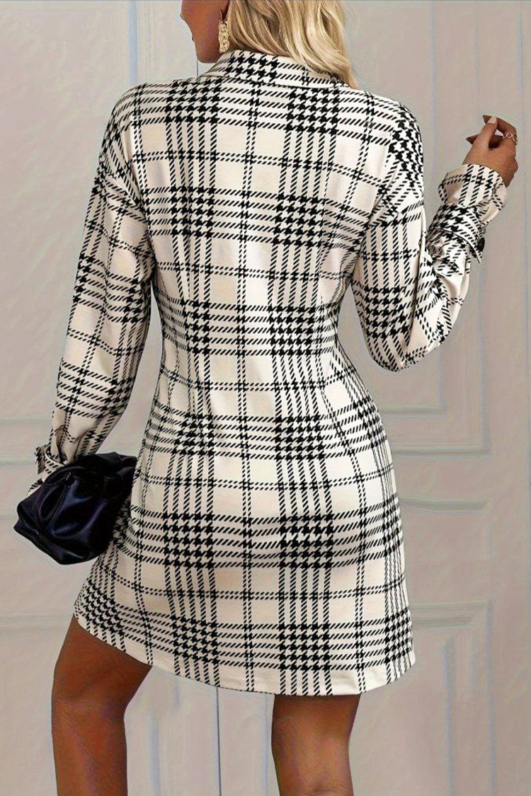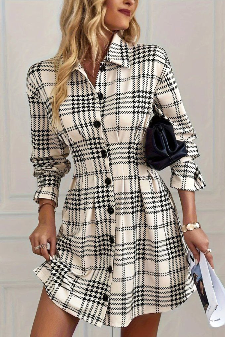 - Rochia are o lungime scurtă, guler elegant, model spectaculos, nasturi pe toată lungimea și mâneci lungi.