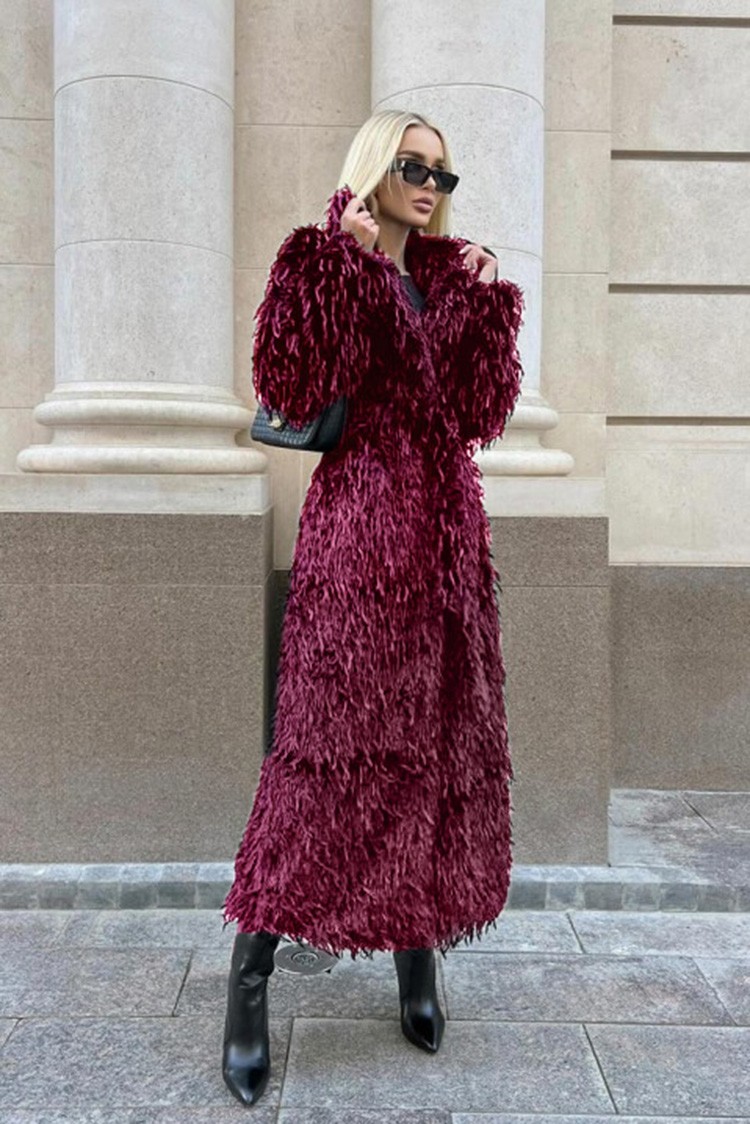 - Paltonul are o croială confortabilă, lungime lungă și are o curea în talie din același material și în aceeași nuanță.