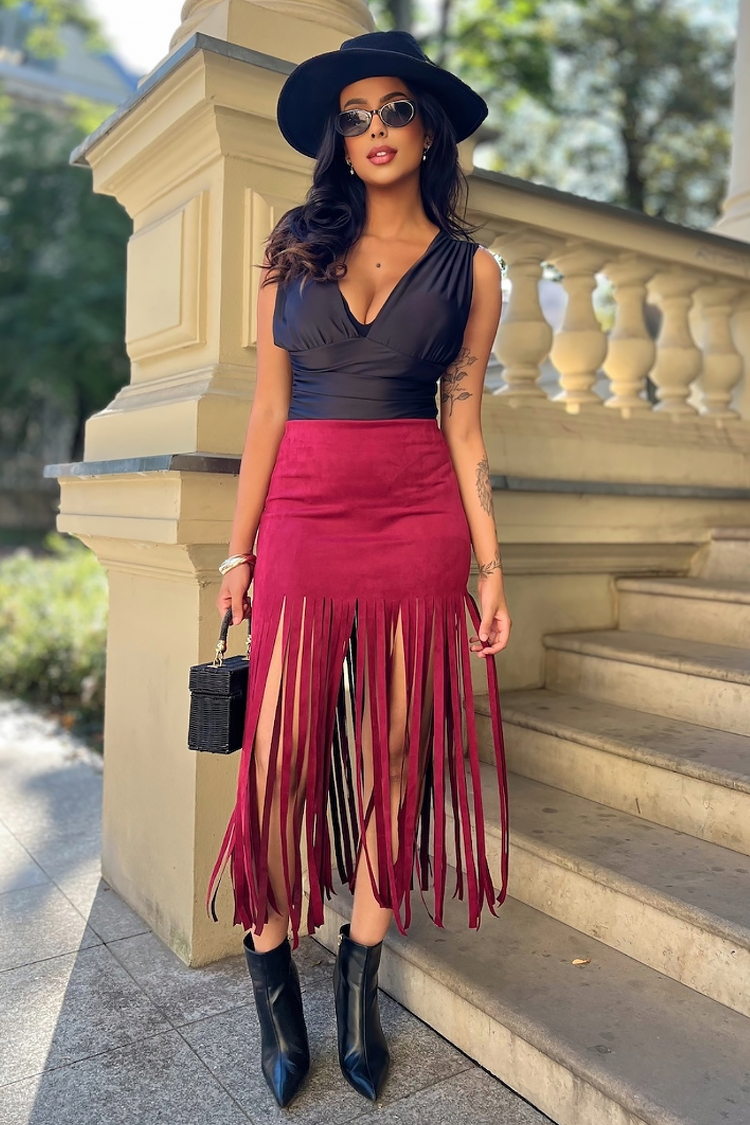 - Fustă midi modernă cu un design sexy, confecționată din piele ecologică, potrivită pentru ținute la modă de zi cu zi.