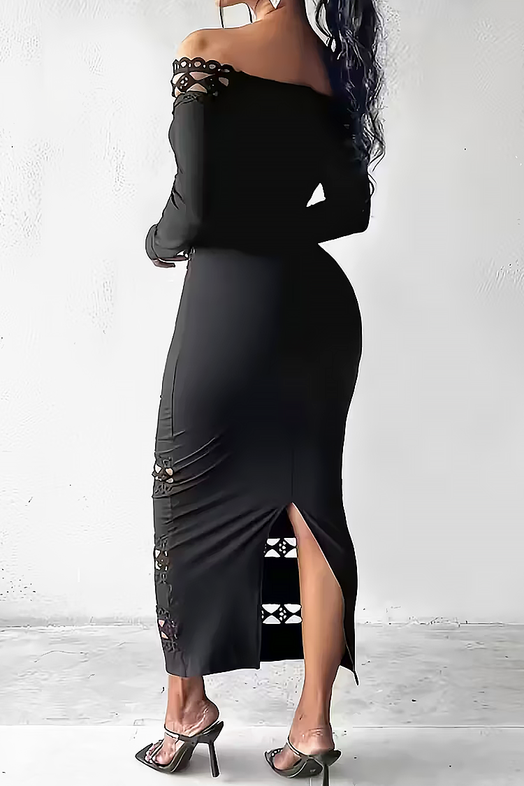 - Rochia are o croială mulată, mâneci lungi, umeri goi și detalii decupate sexy.