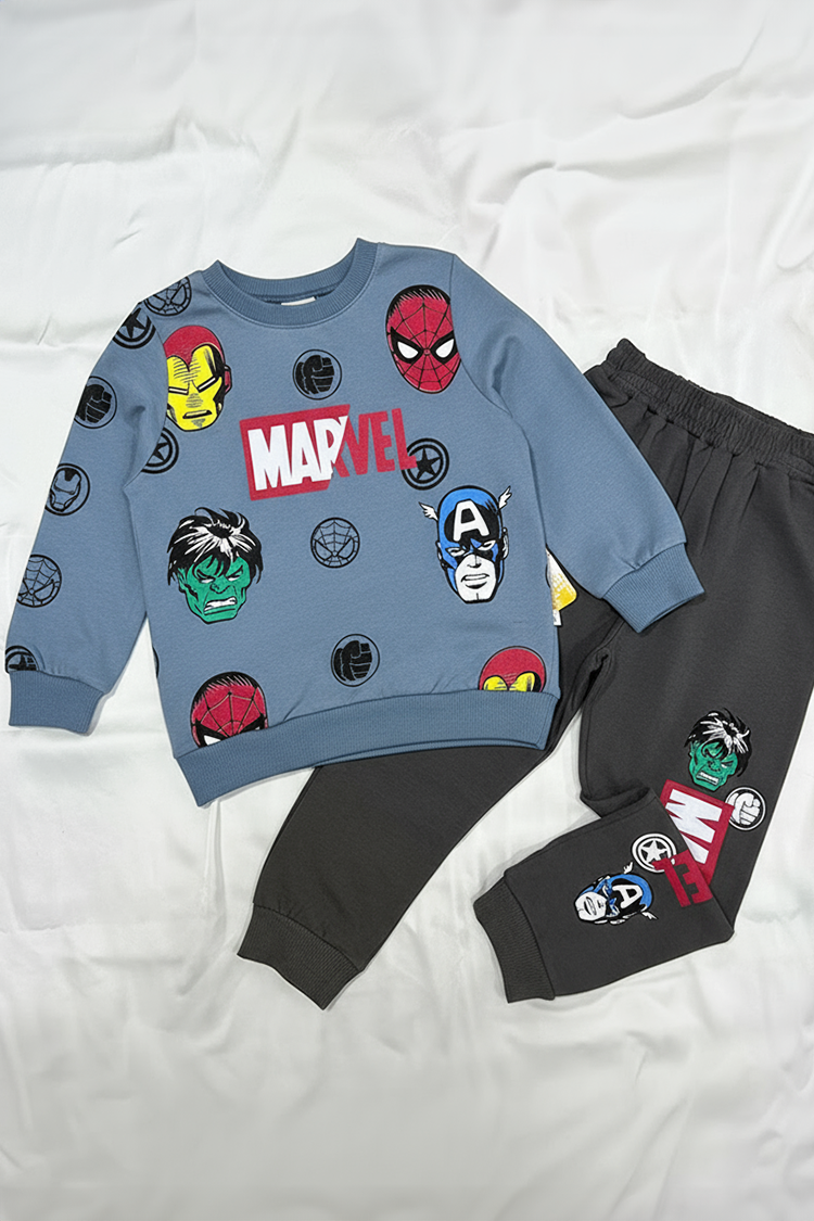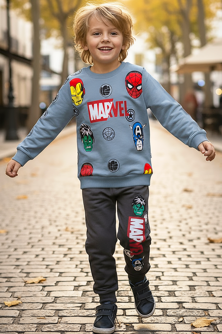 - Bluza re mâneci lungi și un imprimeu Marvel, iar pantalonii au talia înaltă și elastică.