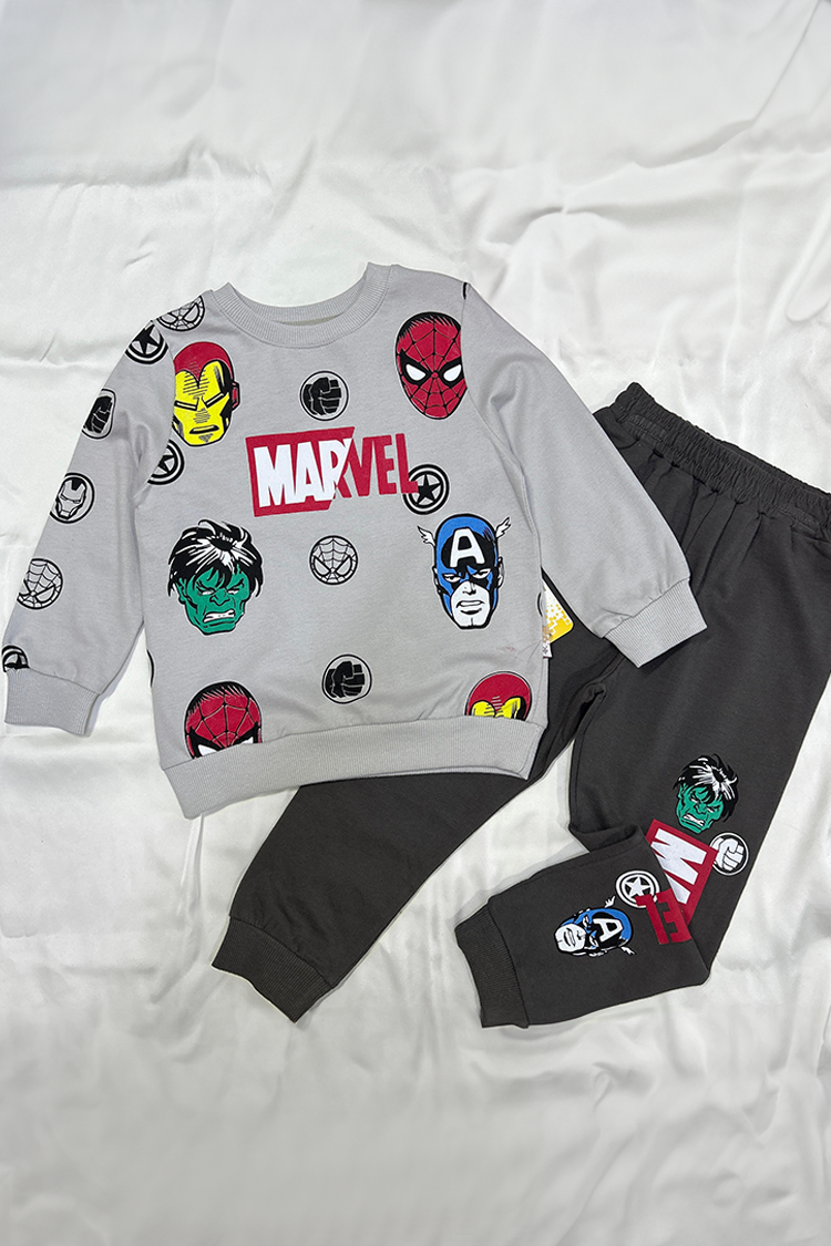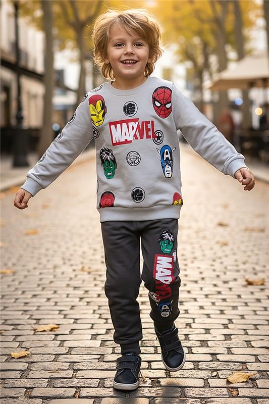 - Bluza re mâneci lungi și un imprimeu Marvel, iar pantalonii au talia înaltă și elastică.