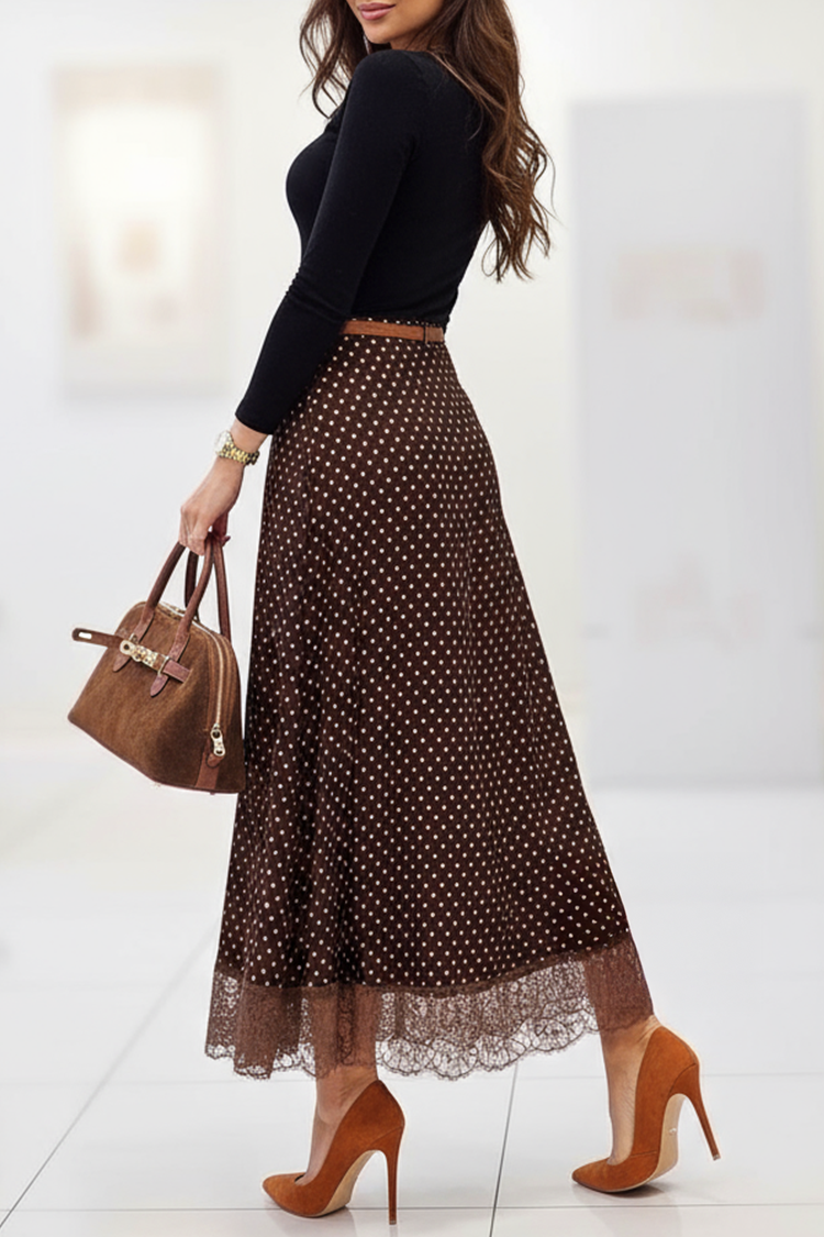 - Modelul are o croială precisă, talie înaltă, model cu buline și dantelă.