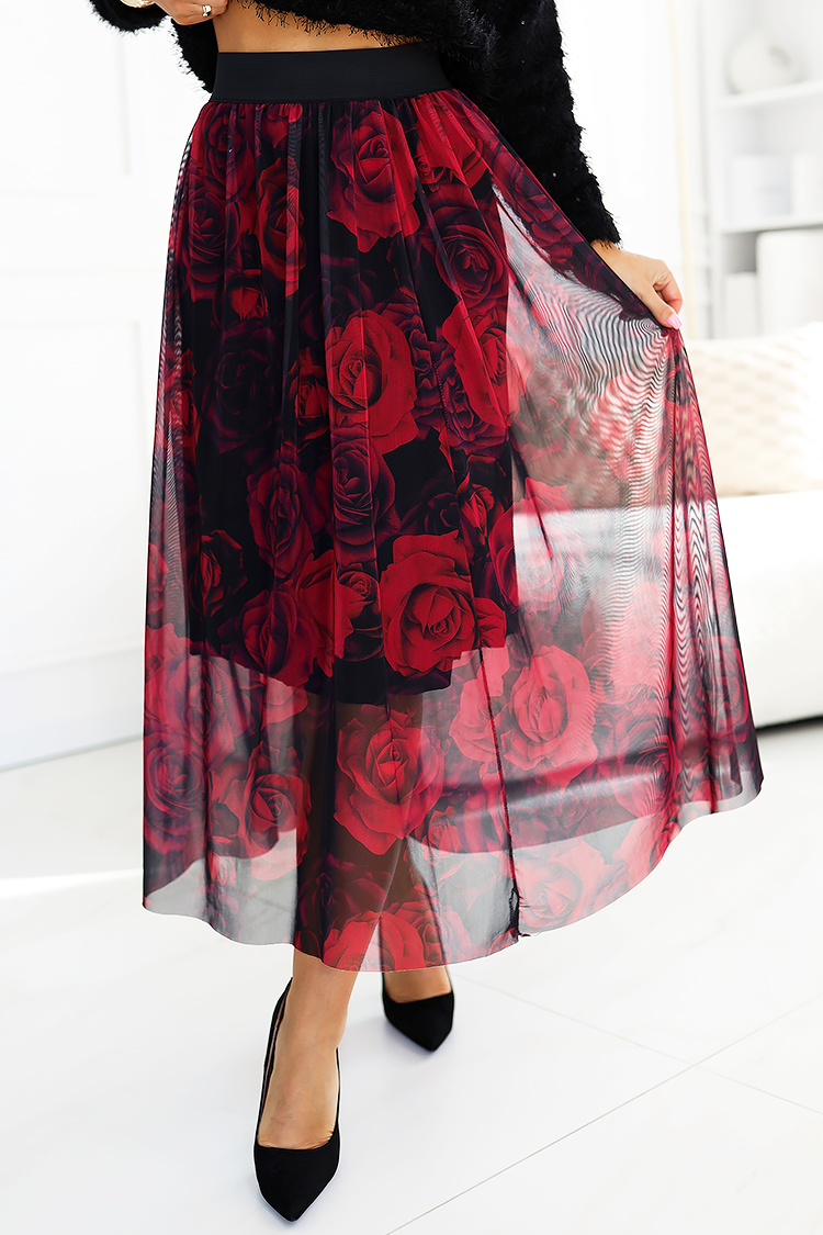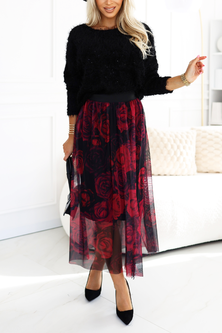 - Modelul are o croială precisă, talie înaltă, model floral și tul.