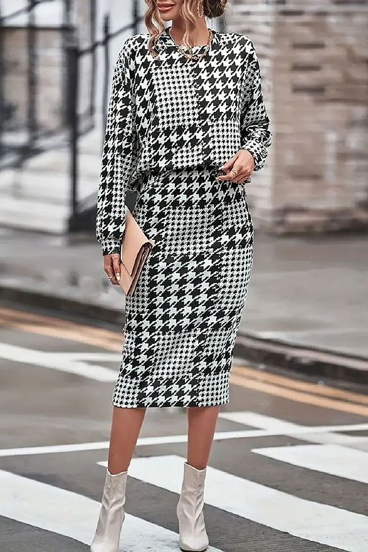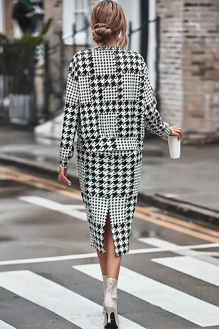 - Bluza are o croială clasică confortabilă, iar fusta este de lungime midi și are o crăpătură sexy.