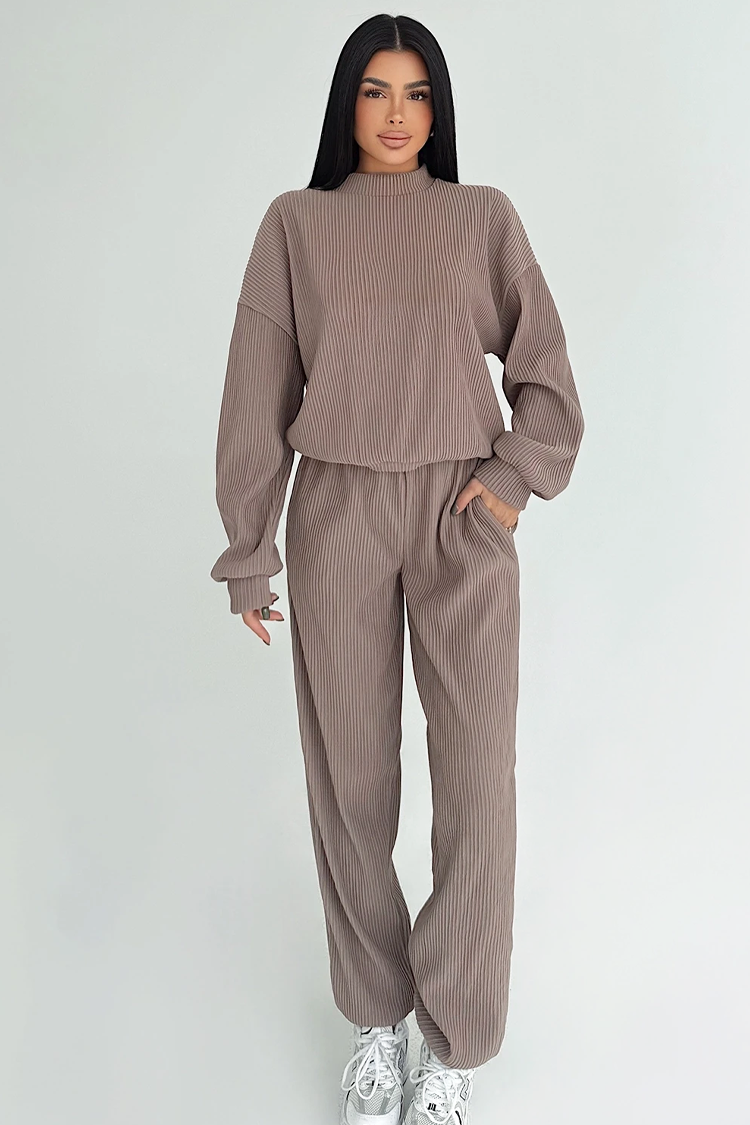 - Set modern din două piese - pantaloni confortabili și o bluză, potrivit pentru viața de zi cu zi.