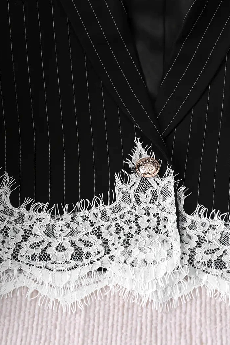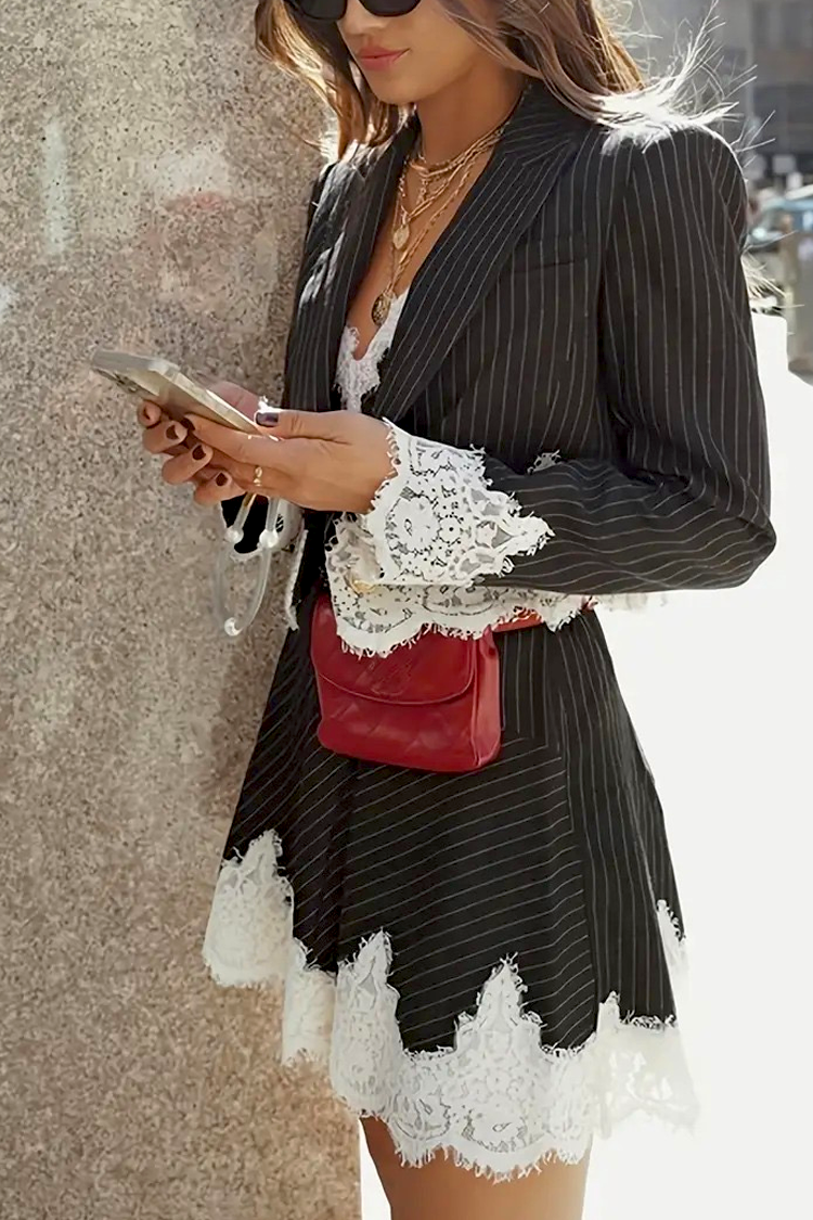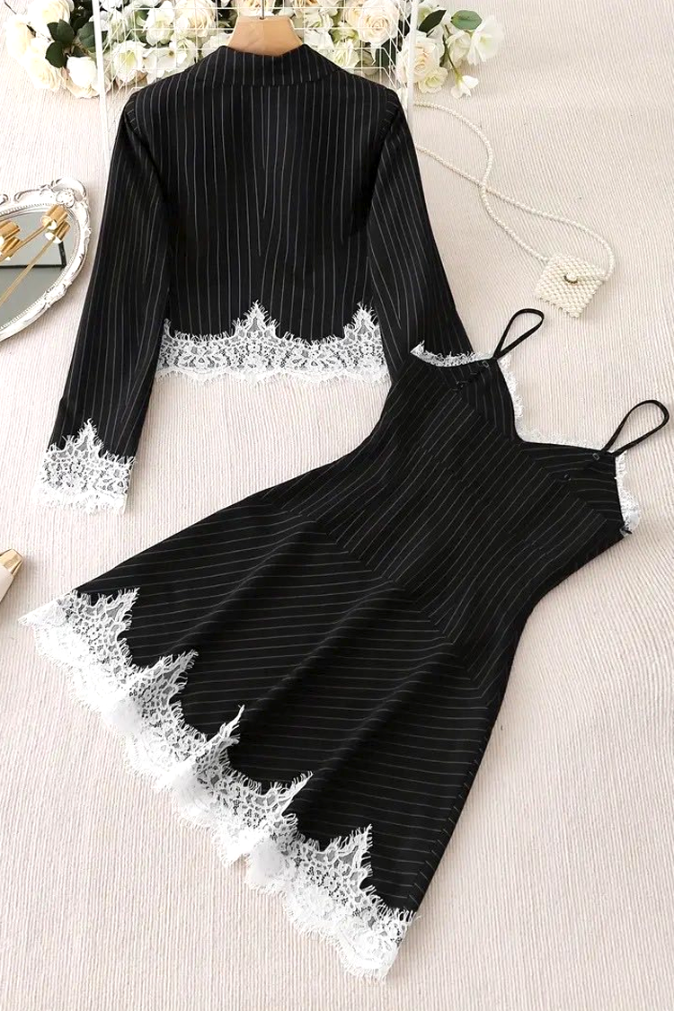 - Set atractiv din două piese, format dintr-o rochie și un sacou cu dantelă și dungi.