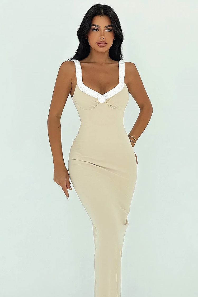 - Rochia are bretele subțiri, o croială mulată și un decolteu sexy.