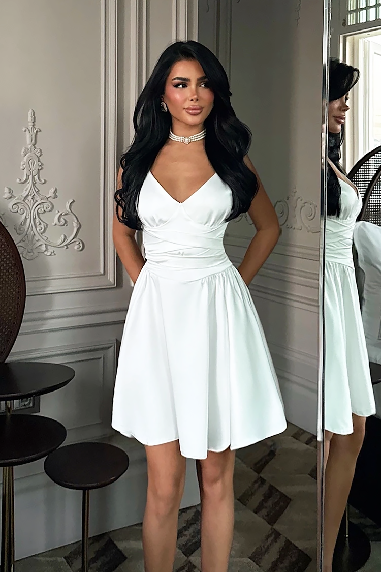 - Rochie scurtă spectaculoasă, de culoare albă, potrivită pentru ținute elegante și de zi cu zi.