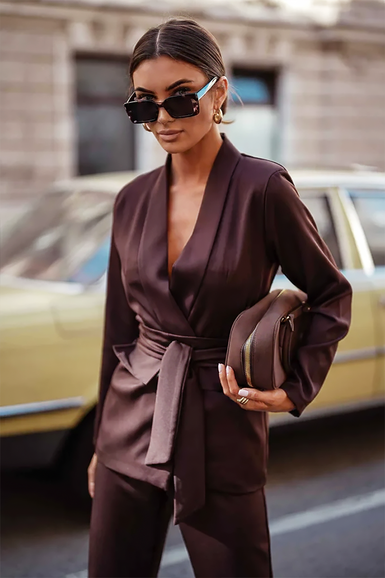 - Pantalonii au talie înaltă și picioare late, iar sacou are un design elegant, guler și curea.