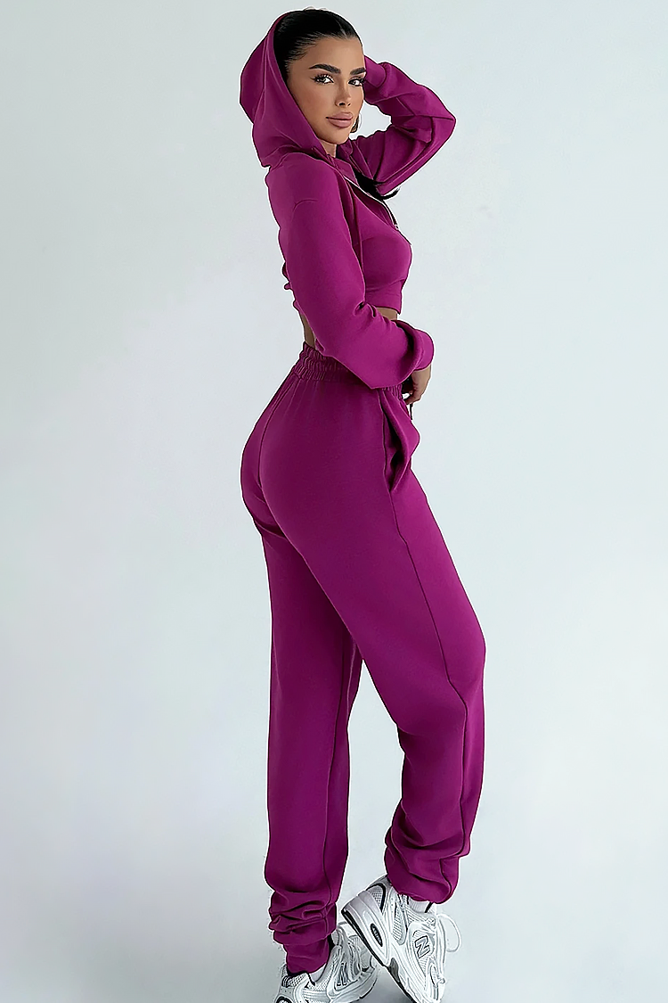 - Pantalonii au o croială confortabilă, talie elastică înaltă și buzunare laterale.