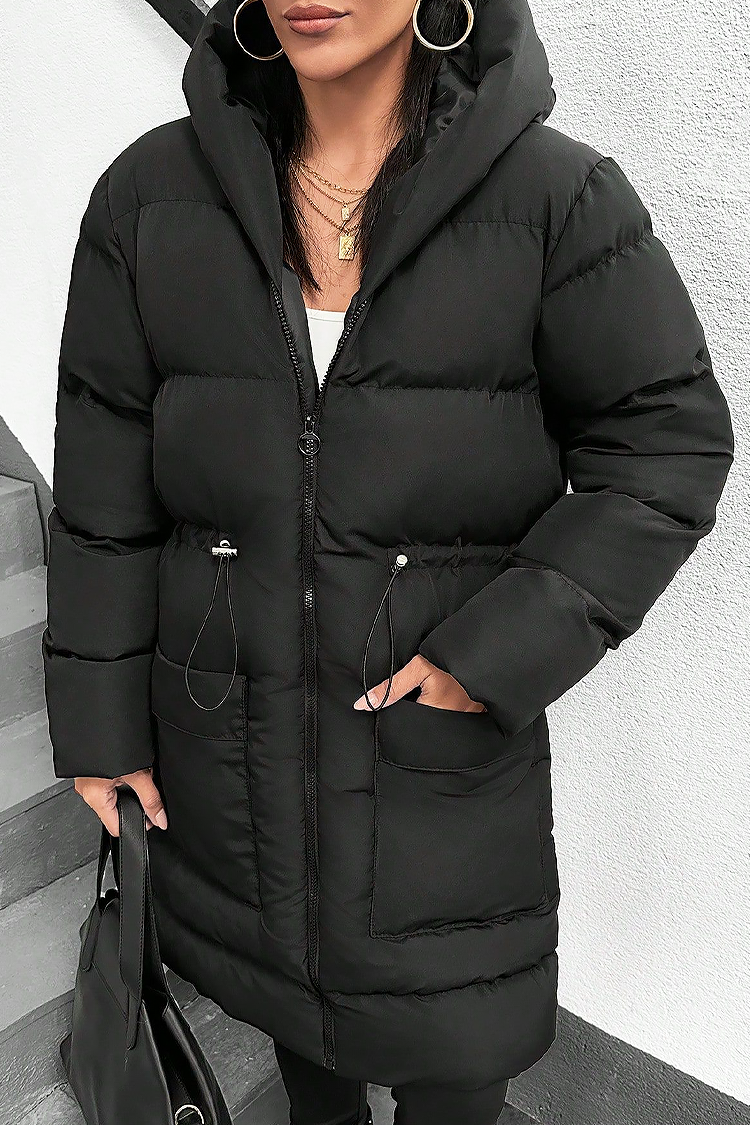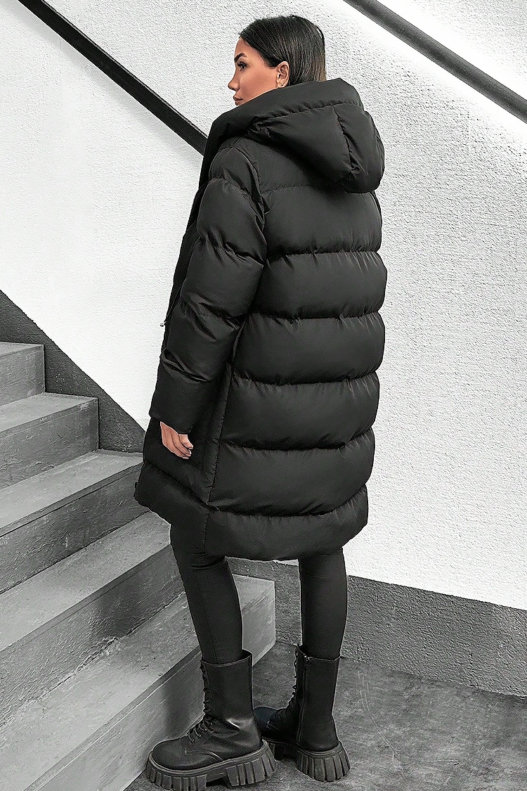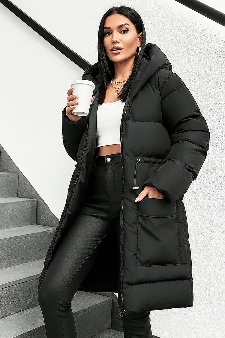 - Modelul are o croială confortabilă, închidere cu fermoar, buzunare practice, glugă și lungime midi.