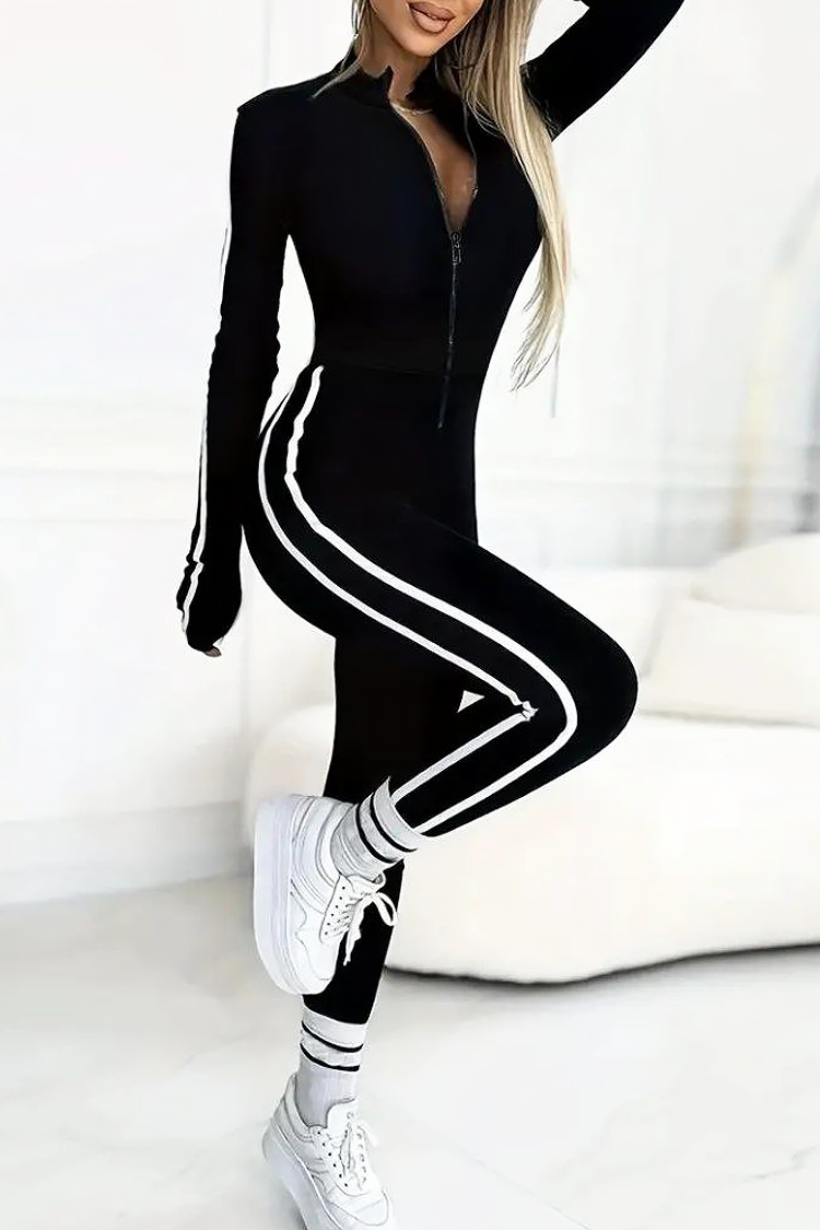 - Salopetă modernă de dama, de culoarea clasică neagră, potrivită atât pentru fitness, cât și pentru viața de zi cu zi.