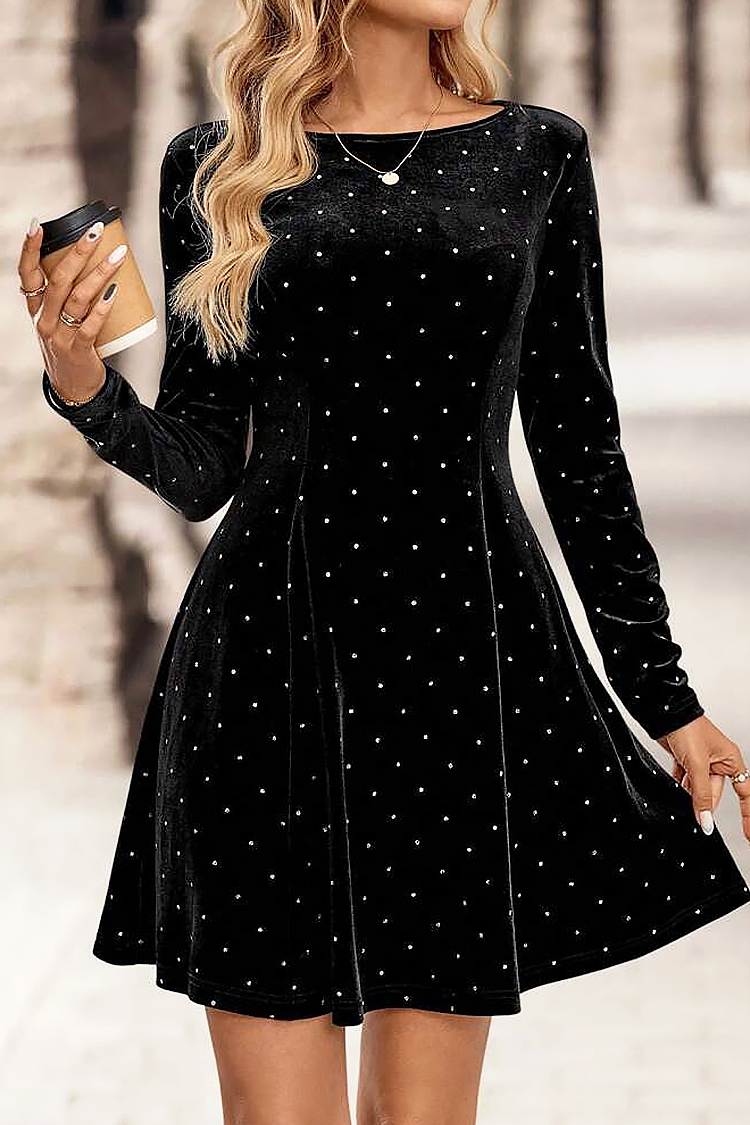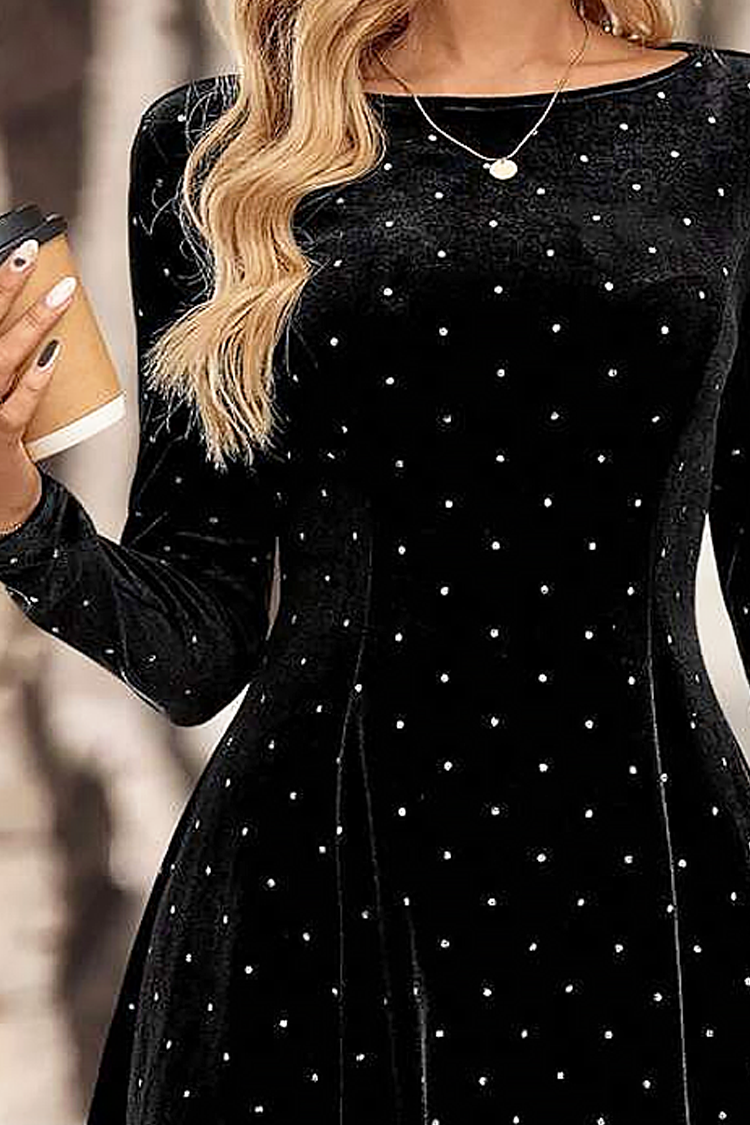 - Rochia are mâneci lungi, o croială mulată și un model spectaculos cu buline.