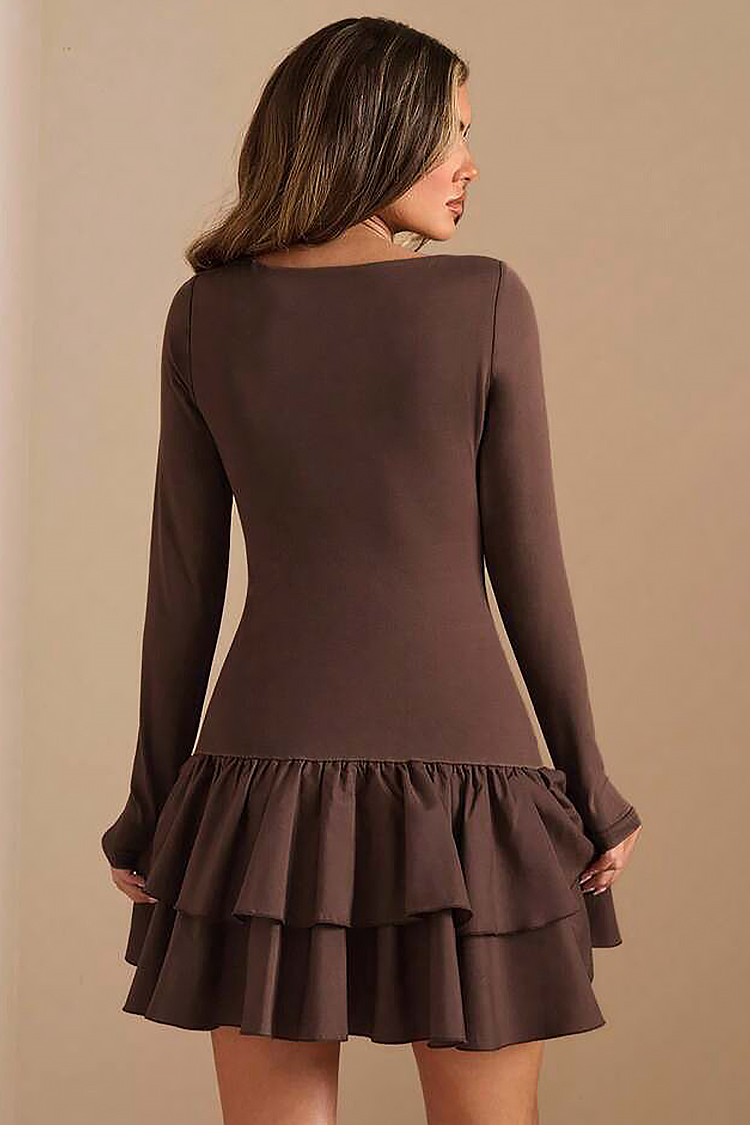 - Rochia are mâneci lungi, o croială mulată și o lungime scurtă.