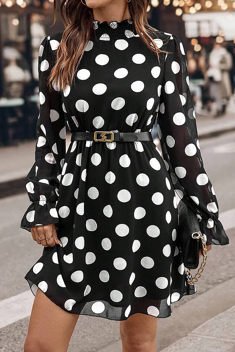 - Pentru un look elegant, alege această rochie drăguță cu buline, potrivită pentru o varietate de combinații vestimentare.