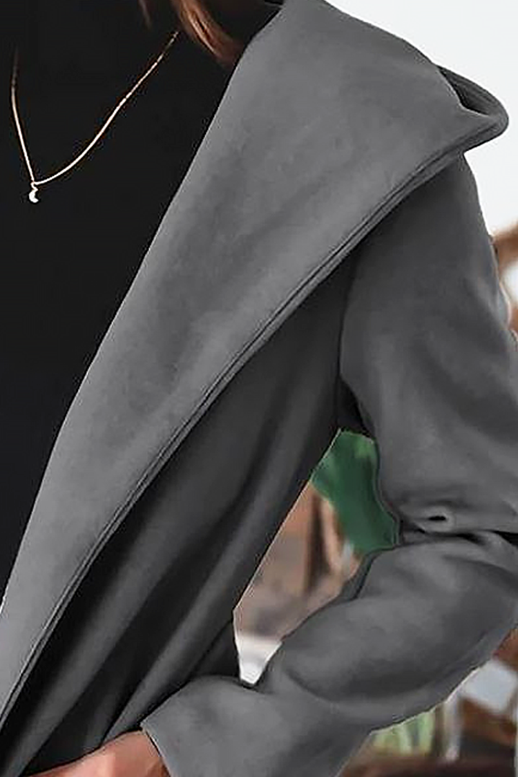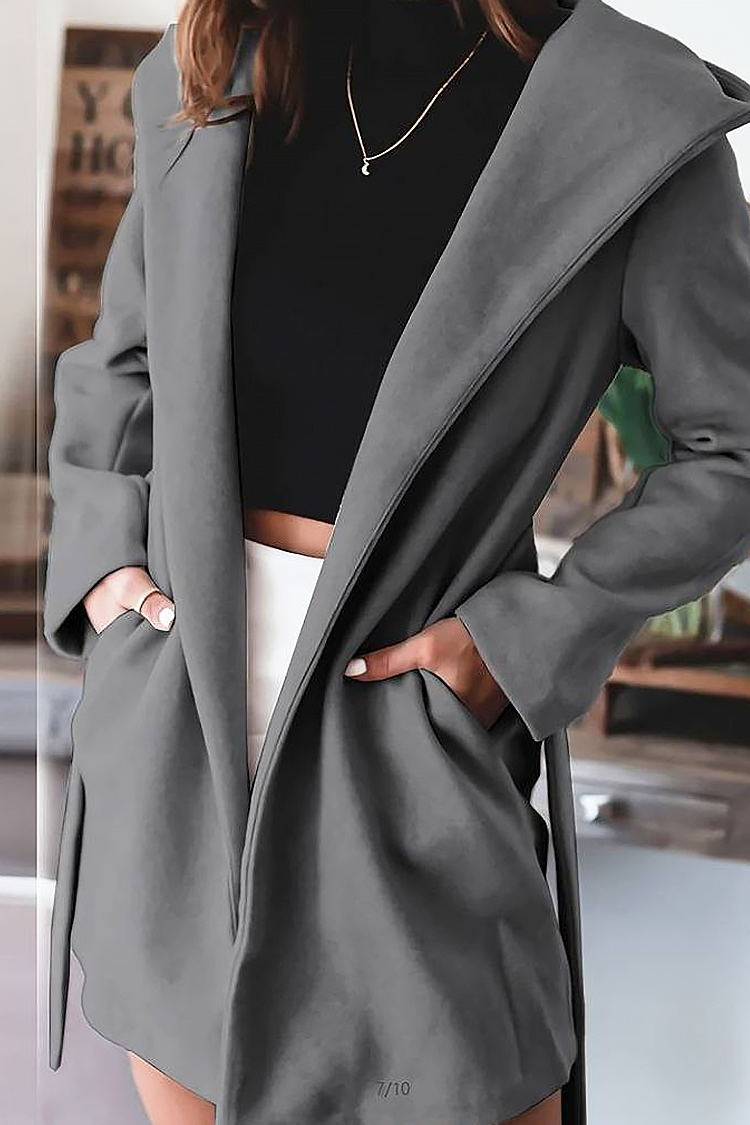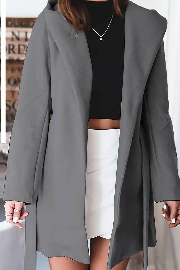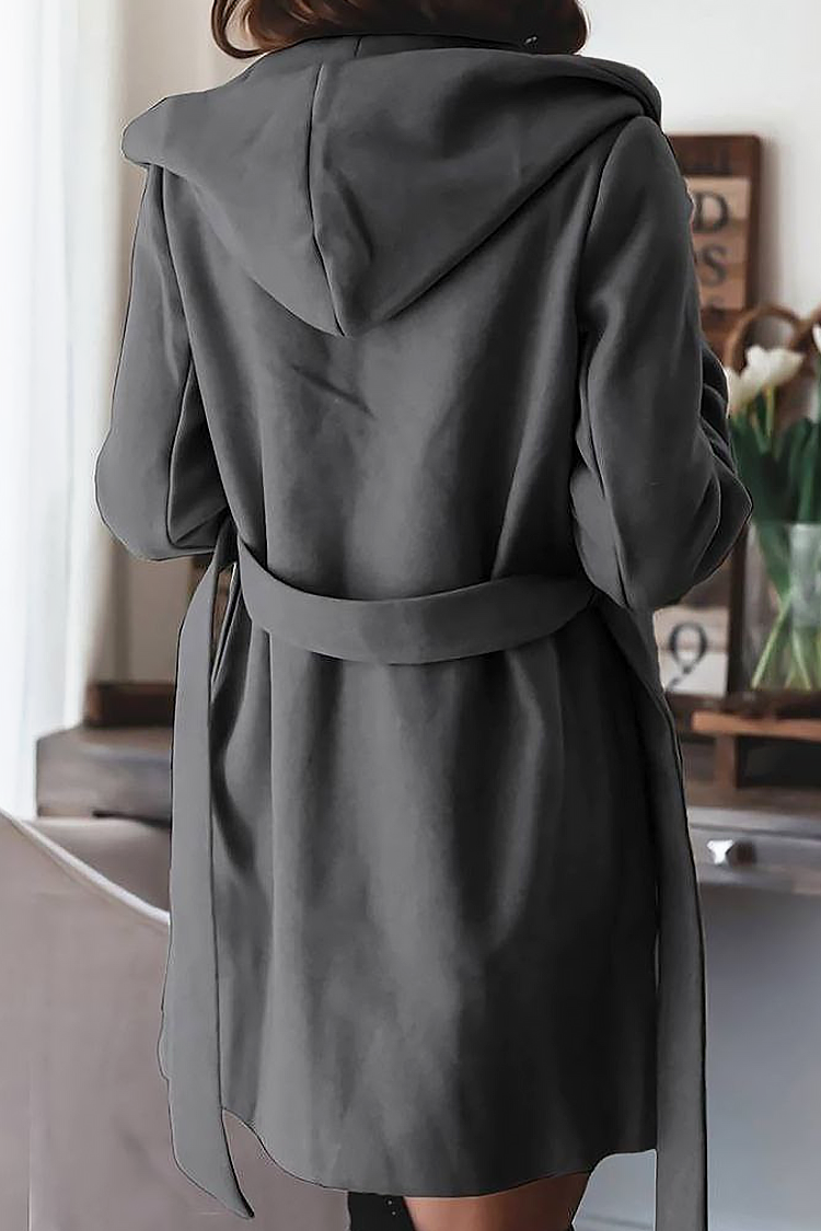 - Modelul are o croială confortabilă, guler, buzunare, curea din același material și glugă.