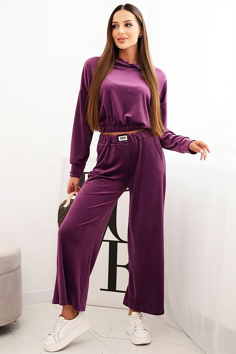 - Setul include pantaloni confortabili cu buzunare și talie înaltă și un hanorac.