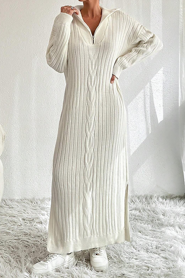 - Rochia are mâneci lungi și un decolteu spectaculos cu fermoar și guler.