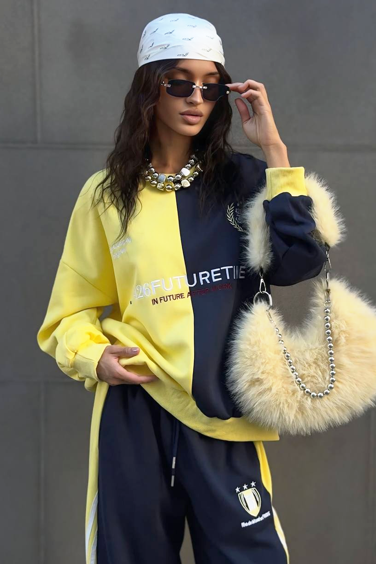 - Bluza are o croială lejeră, iar pantalonii au talie elastică cu legături.