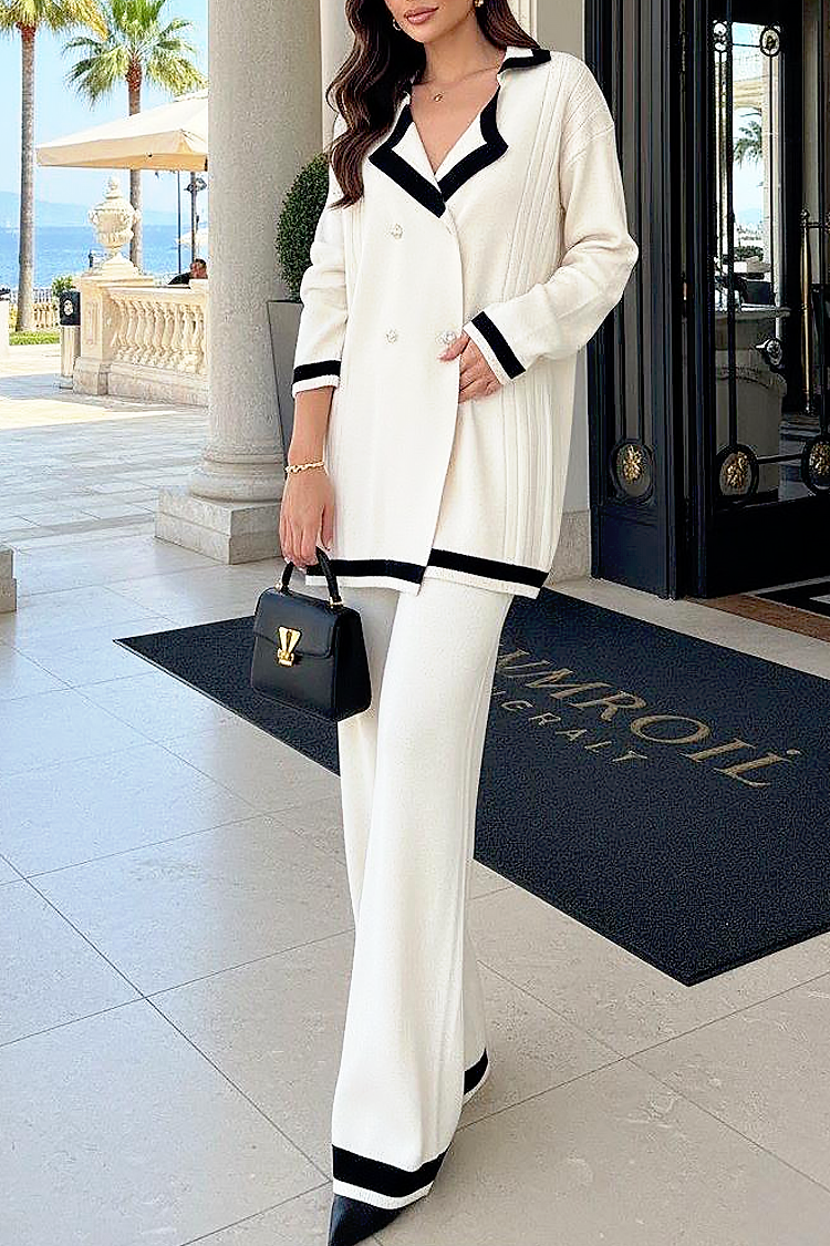 - Vesta are o croială elegantă, guler și nasturi spectaculoși, iar pantalonii au un design evazat și talie elastică.