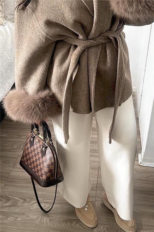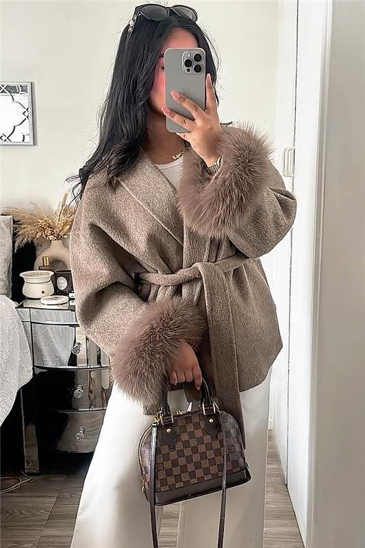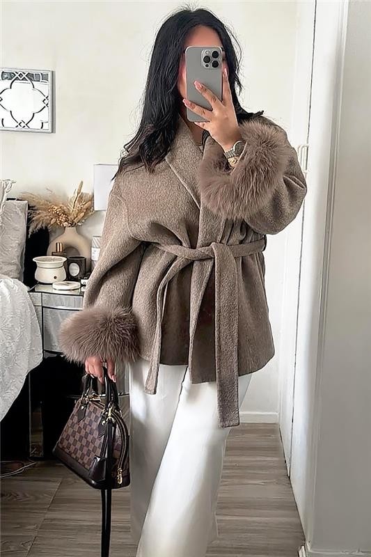 - Modelul are o croială confortabilă, guler, curea din același material și manșete spectaculoase cu puf la mâneci.
