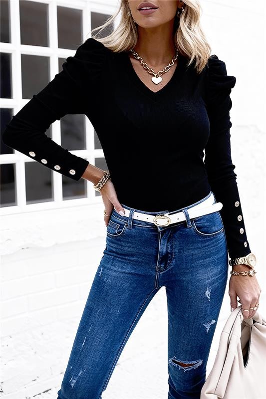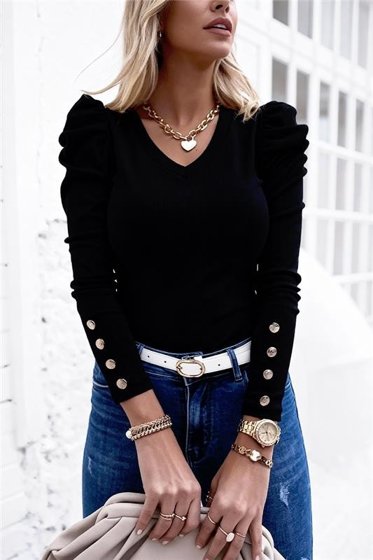 - Bluza are o croială clasică și confortabilă, cu un design șic, cu nasturi la mâneci.