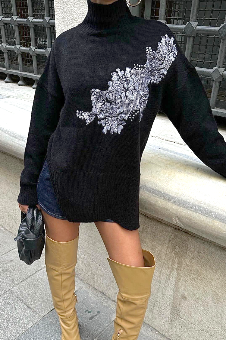 - Modelul are mâneci lungi, guler înalt de tip polo și o croială confortabilă.