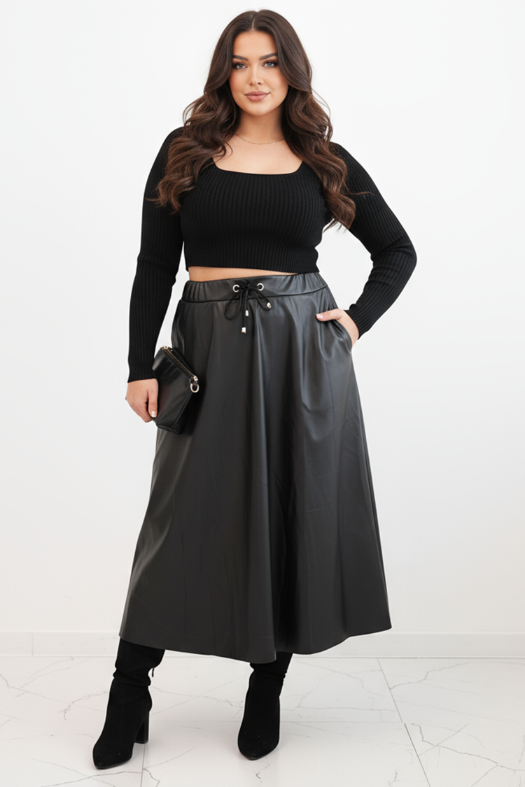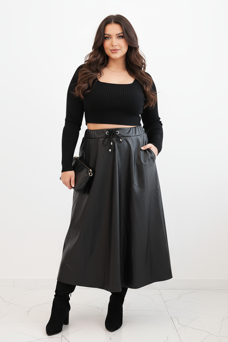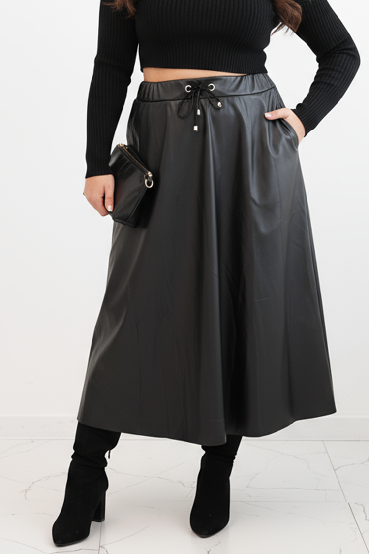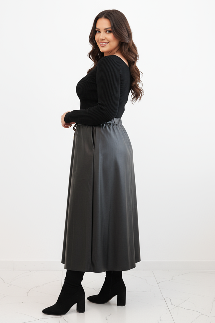 - Fustă midi la modă, confecționată din piele ecologică, potrivită pentru purtare zilnică.