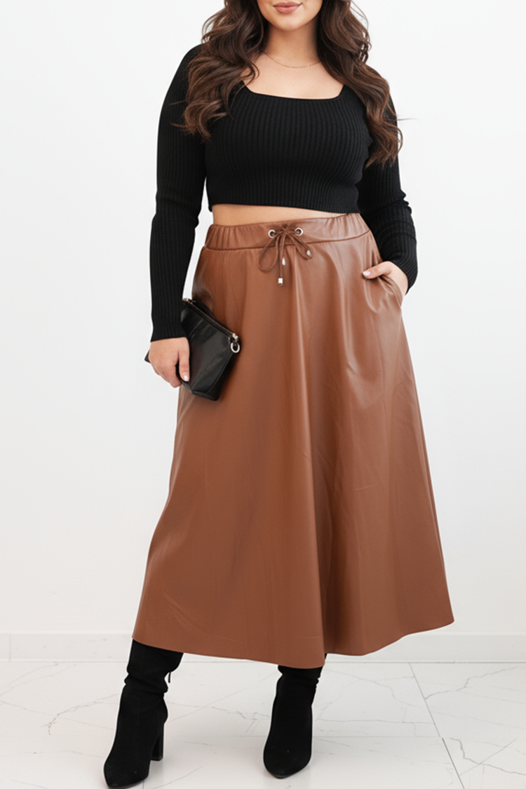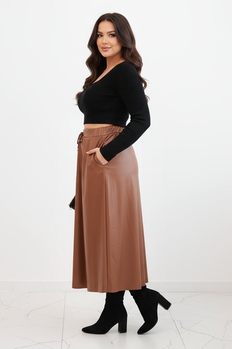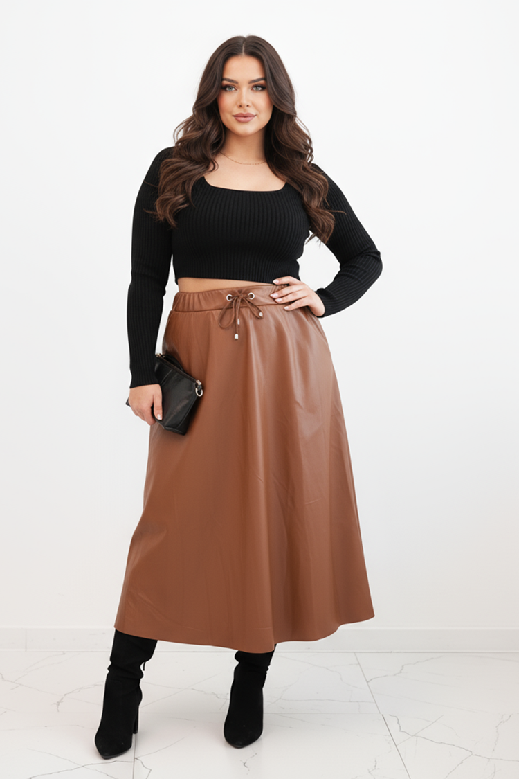 - Fustă midi la modă, confecționată din piele ecologică, potrivită pentru purtare zilnică.
