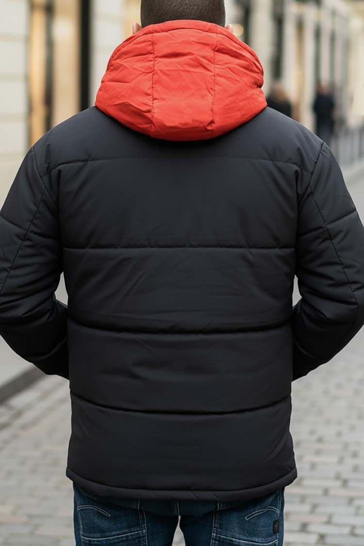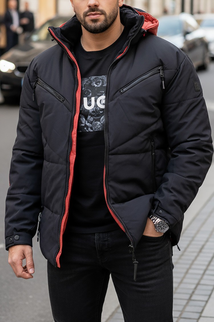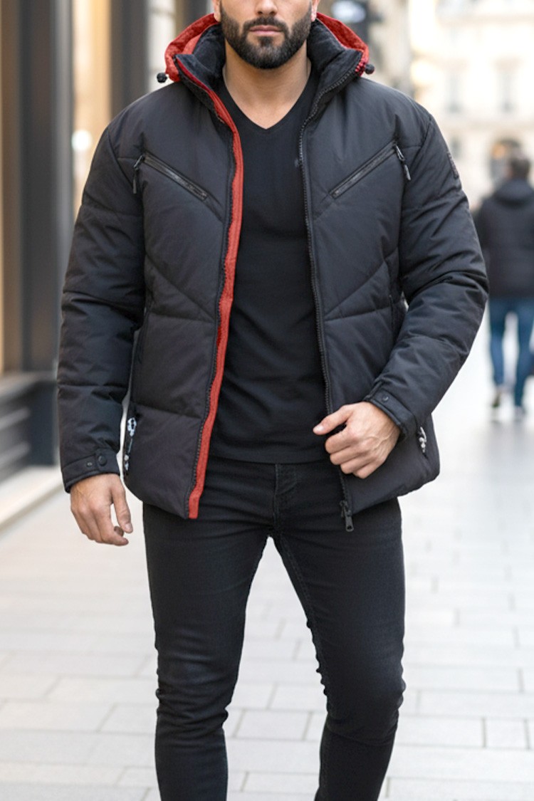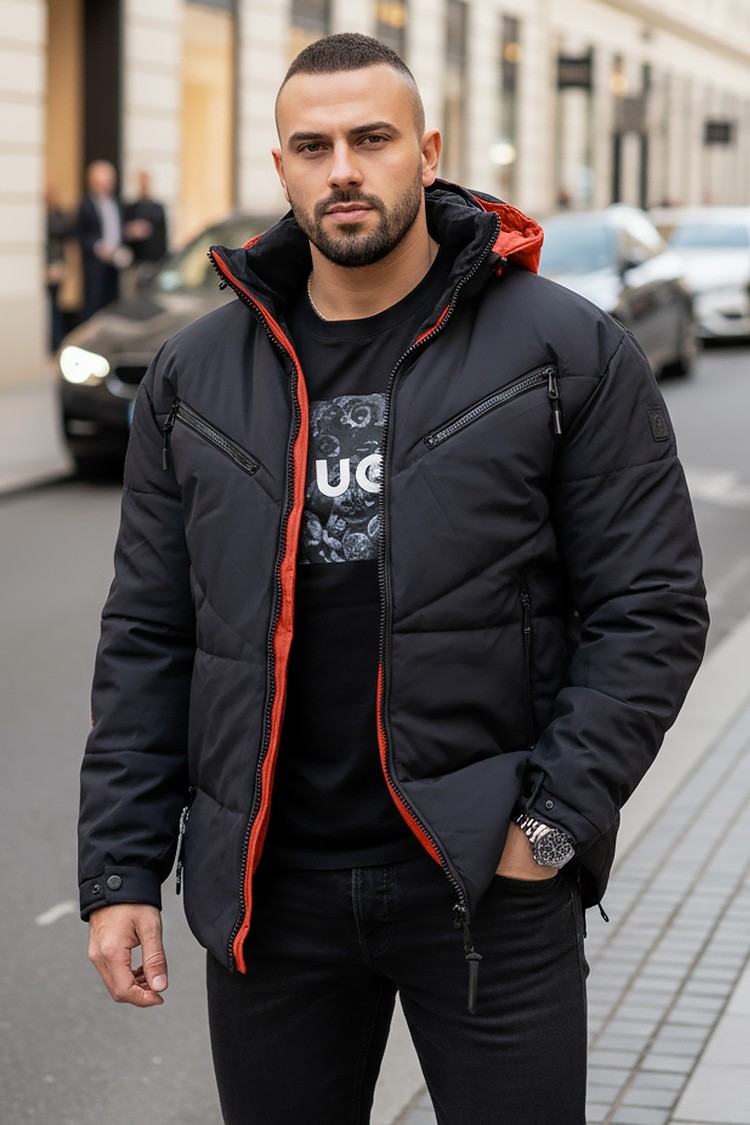 - Geacă de iarnă elegantă și călduroasă pentru bărbați, de culoare neagră cu un efect mat, care combină confortul cu designul urban modern.