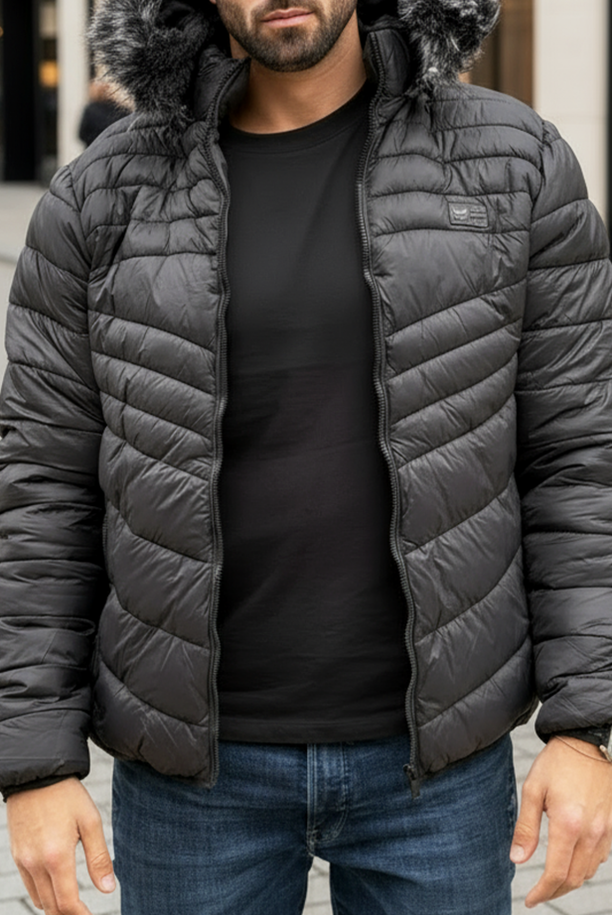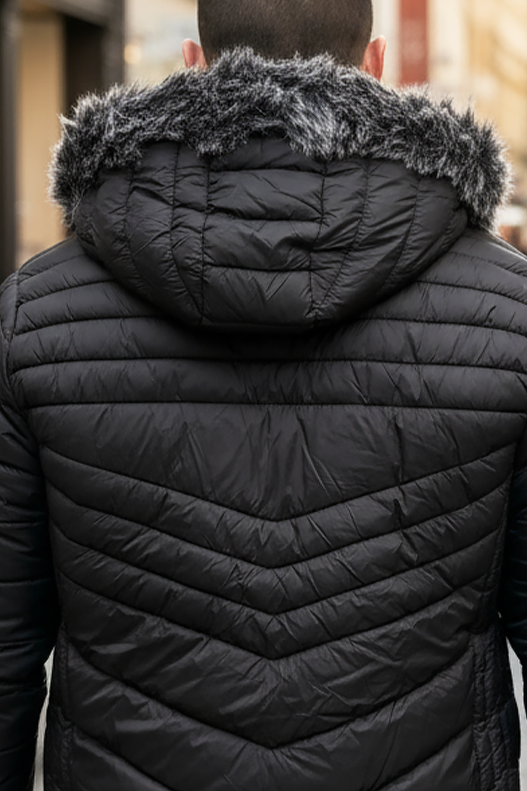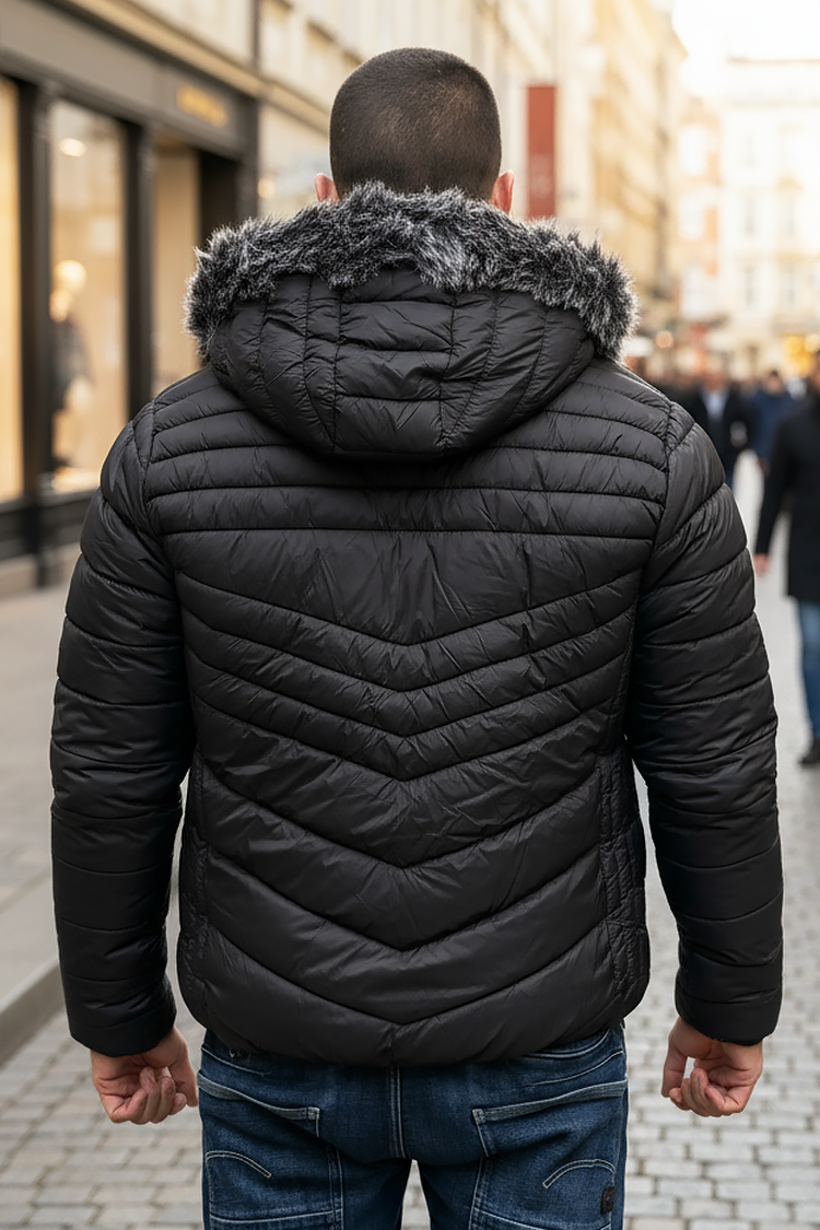 - Geacă de iarnă pentru bărbați, model de zi cu zi, cu căptușeală călduroasă și design matlasat, de culoare neagră.
