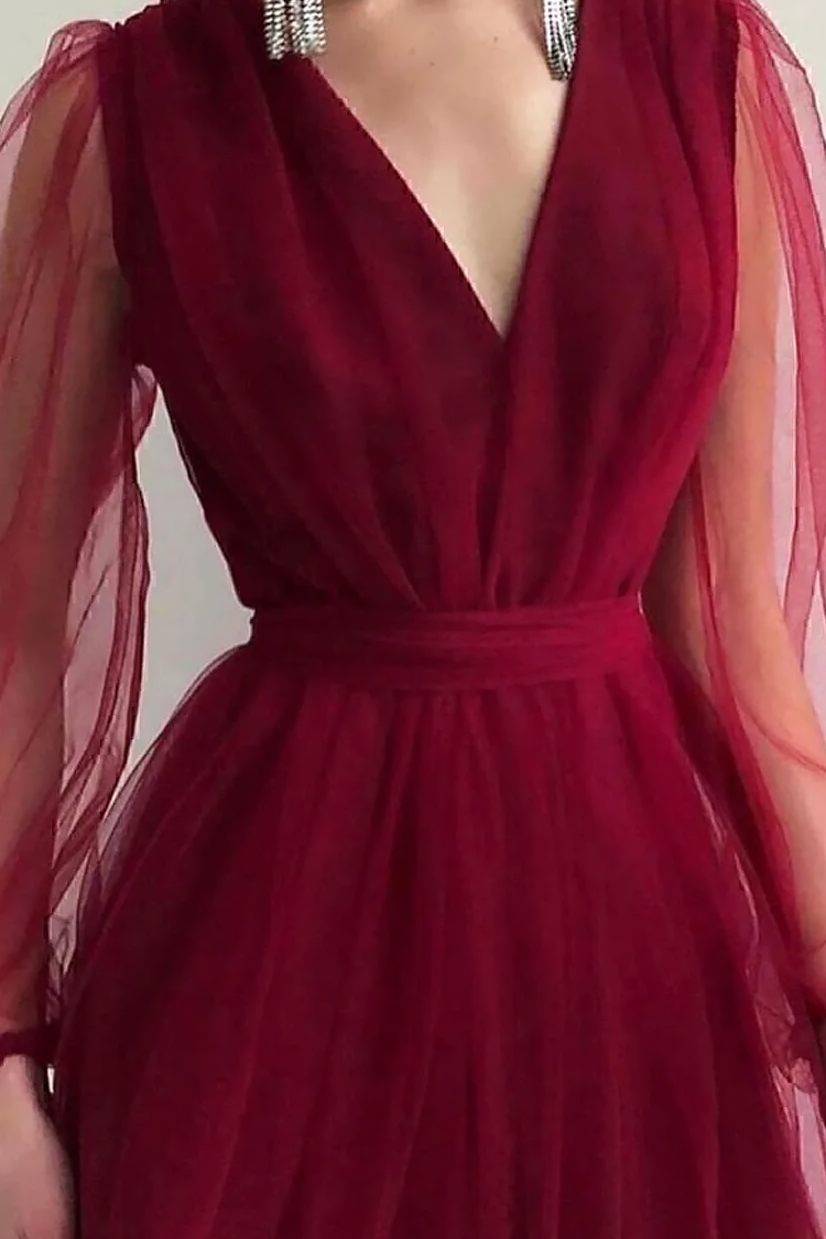 - Rochia are o croială evazată, decolteu V, mâneci lungi și tul spectaculos.