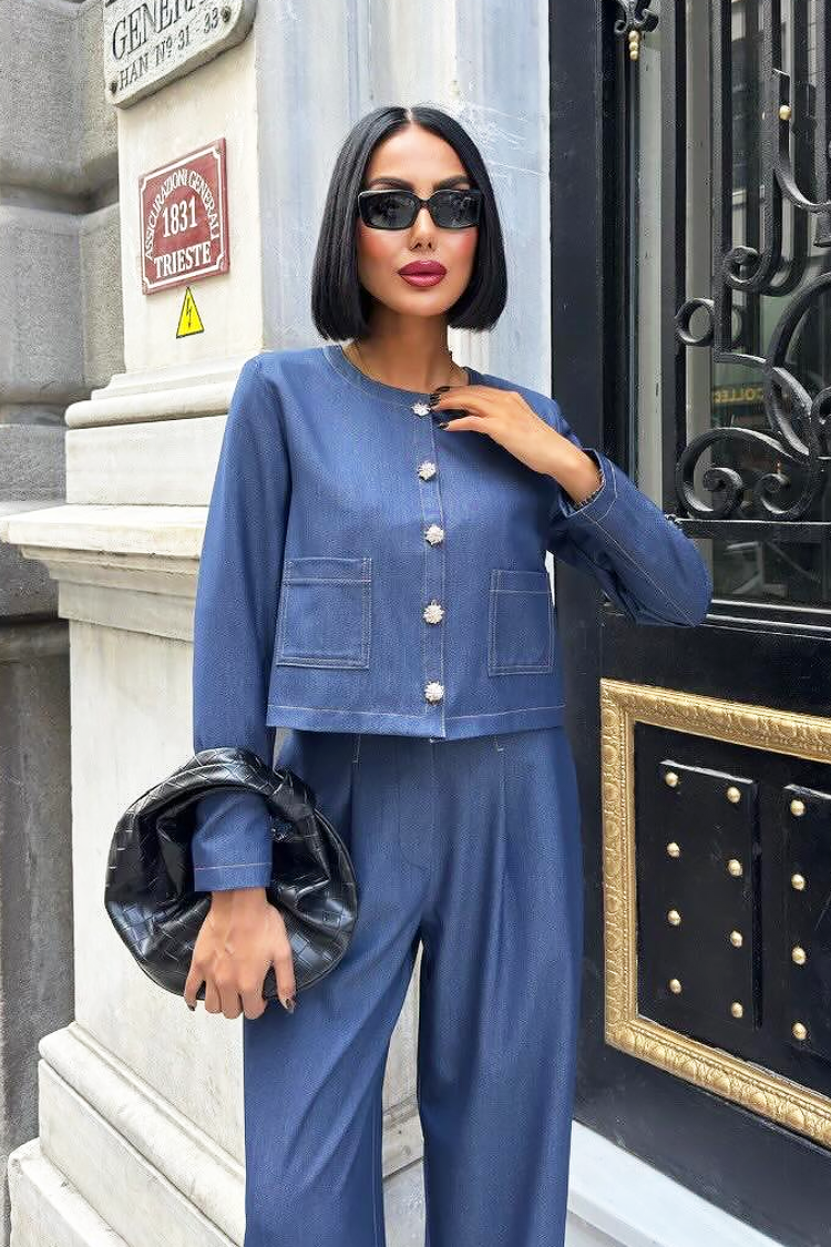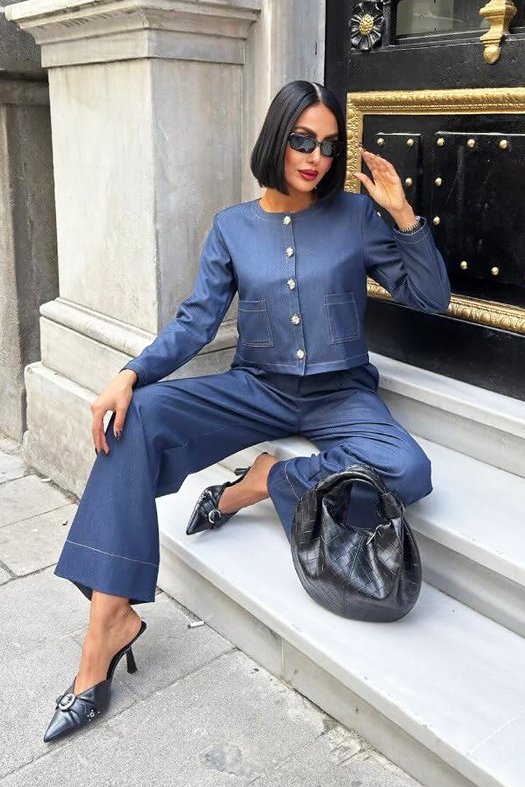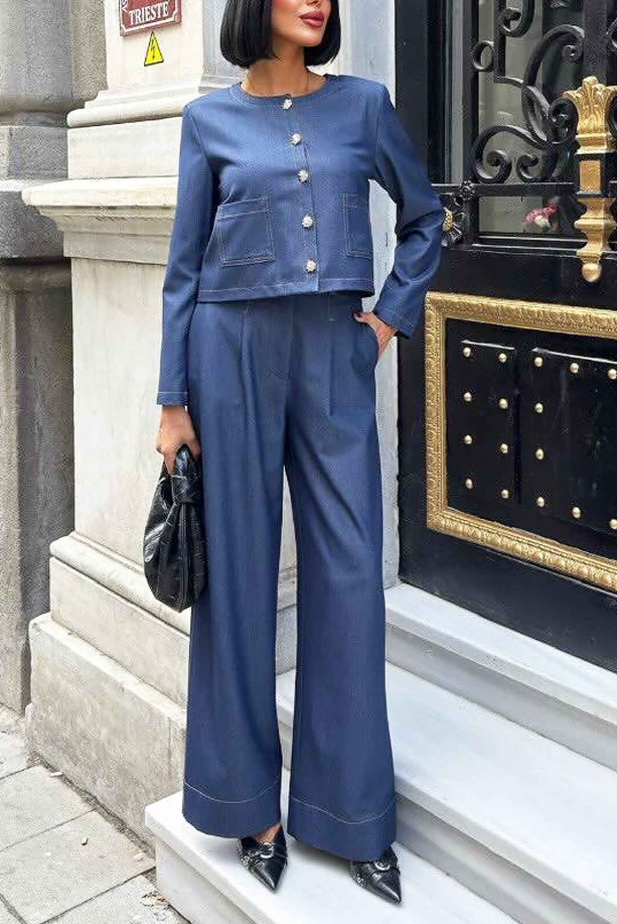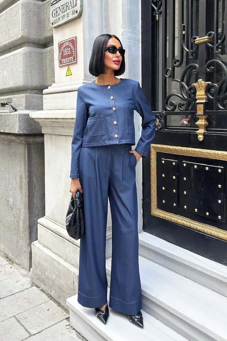 - Pantalonii au talie înaltă, si picioare late și buzunare laterale.