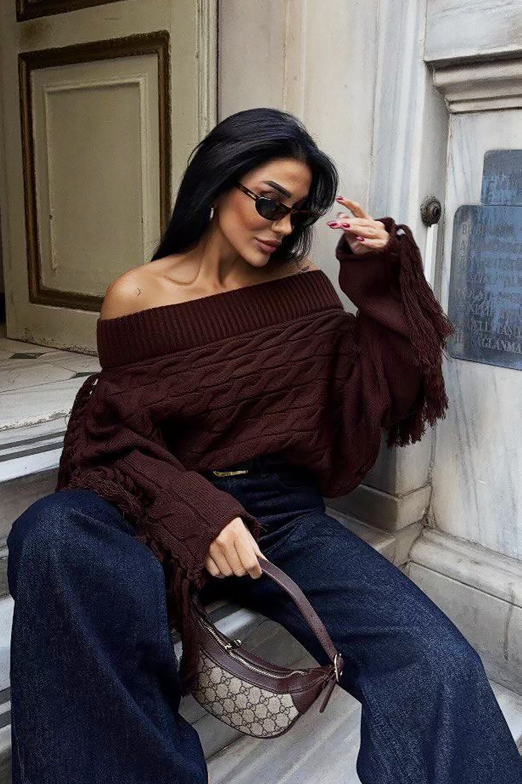 - Pulover elegant de damă, de culoare maro, potrivit pentru ținute de zi cu zi și la modă.