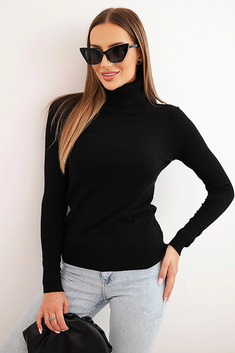 - Modelul are o croială confortabilă și un guler înalt de tip „polo”.
