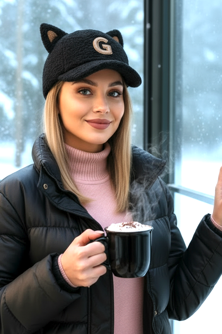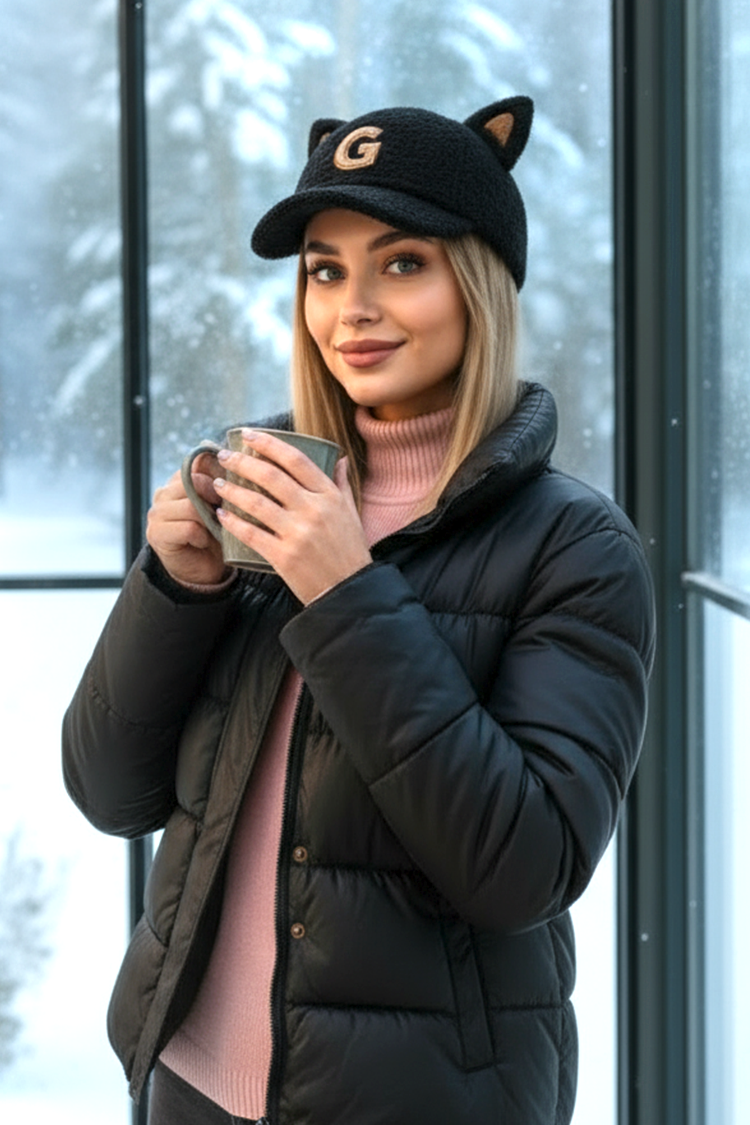 - Pentru un look elegant în zilele reci, alege această șapcă pufoasă cu vizieră și urechi.